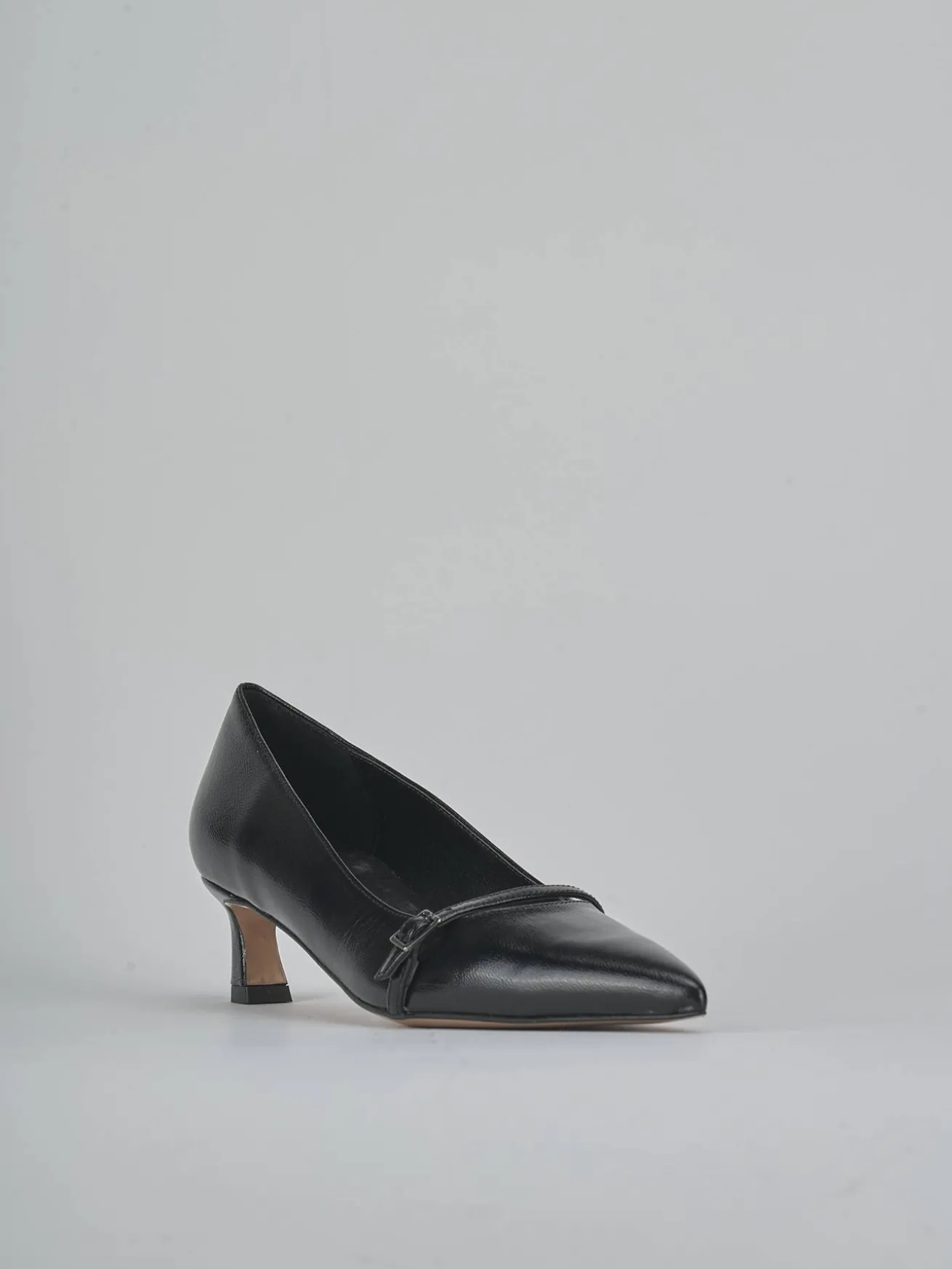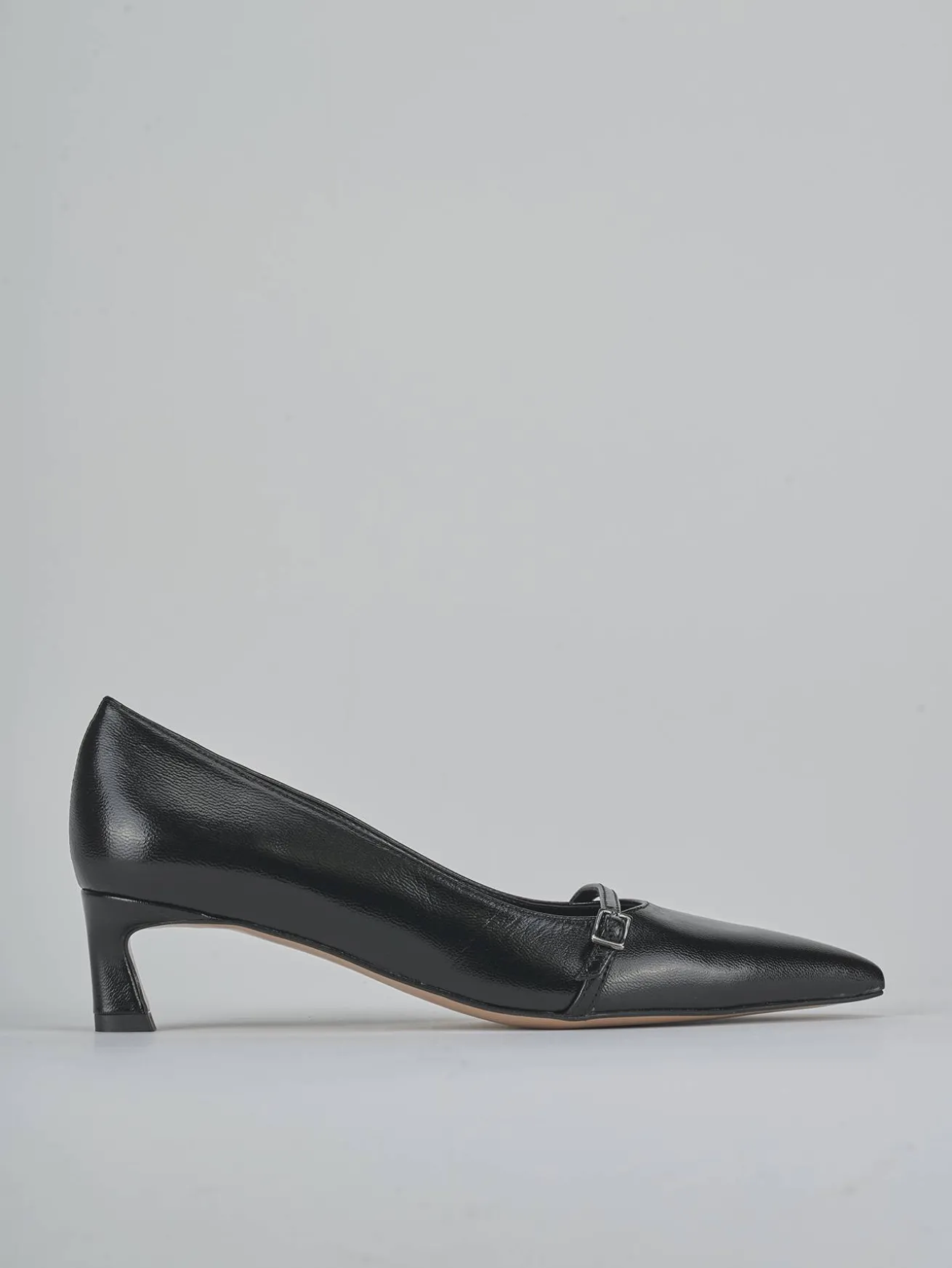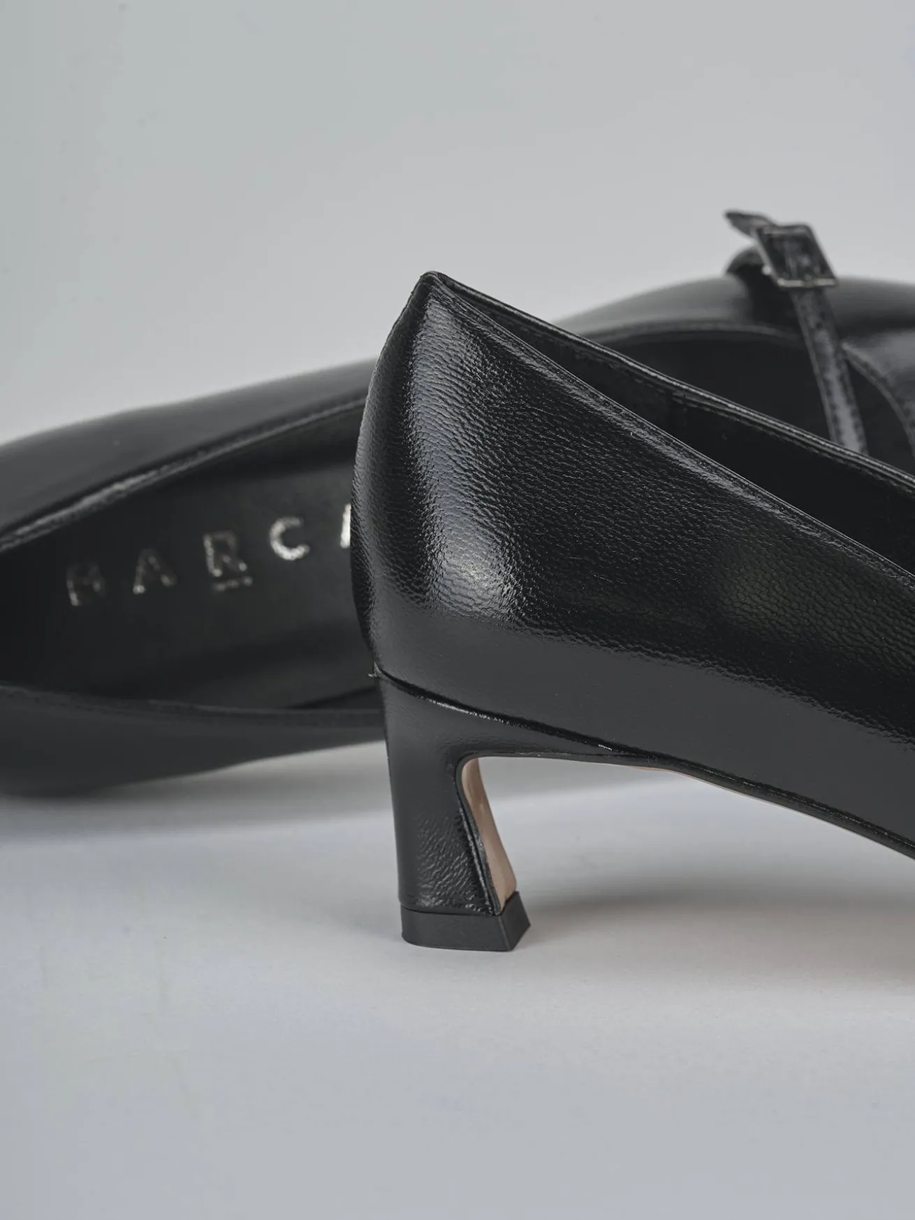 La tomaia in morbida pelle effetto verniciato si distingue per la sua punta sfilata e lo scollo a ‘U’, che aggiungono un tocco di classe.