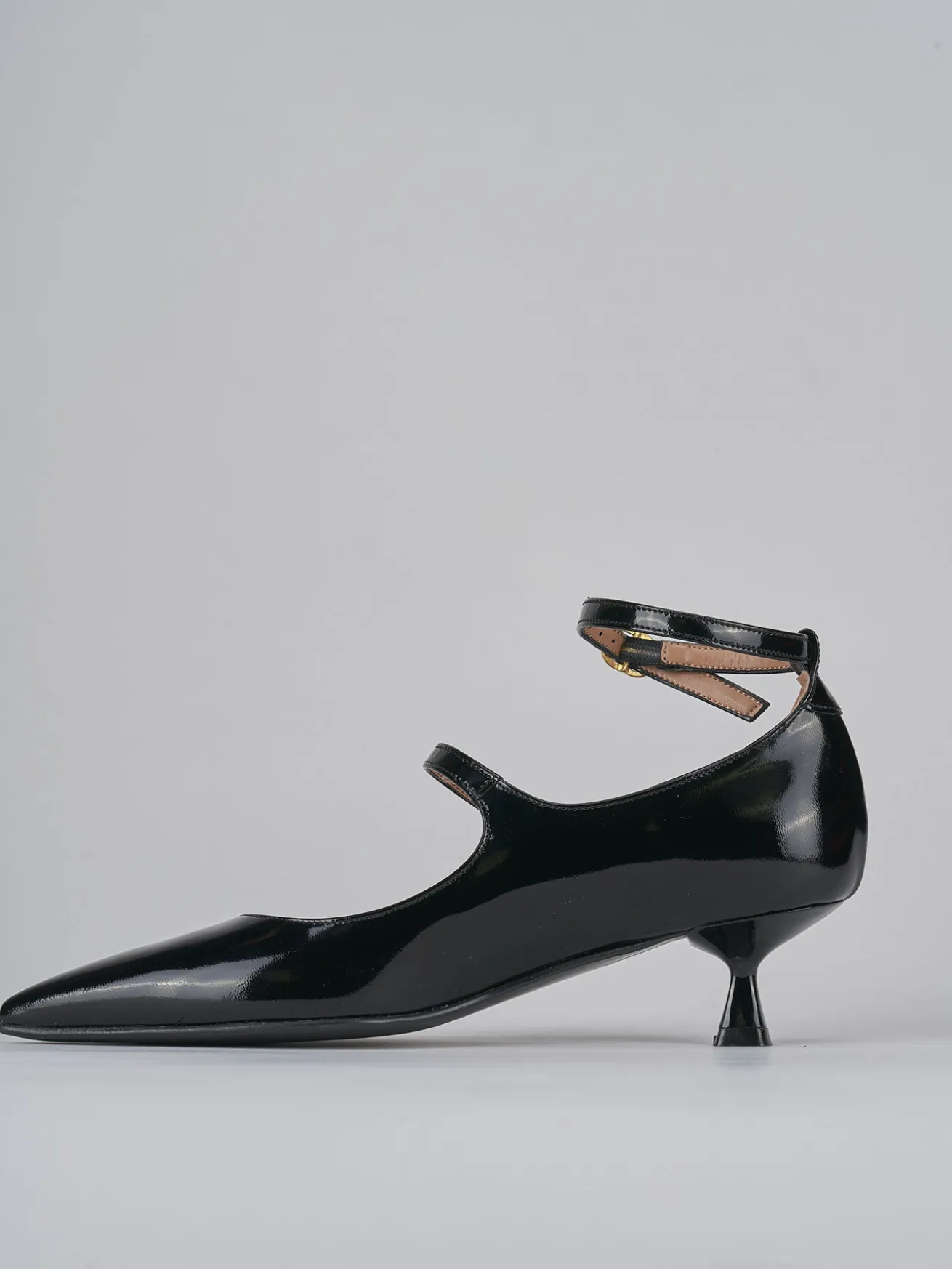 bebe’ tacco 4.5 fondo in gomma e soletto interno in vera pelle. tomaia in morbida pelle effetto verniciato, punta squadrata, apertura arrontondata, cincutini con fibbia regolabile, tacco rocchetto per un look chic.