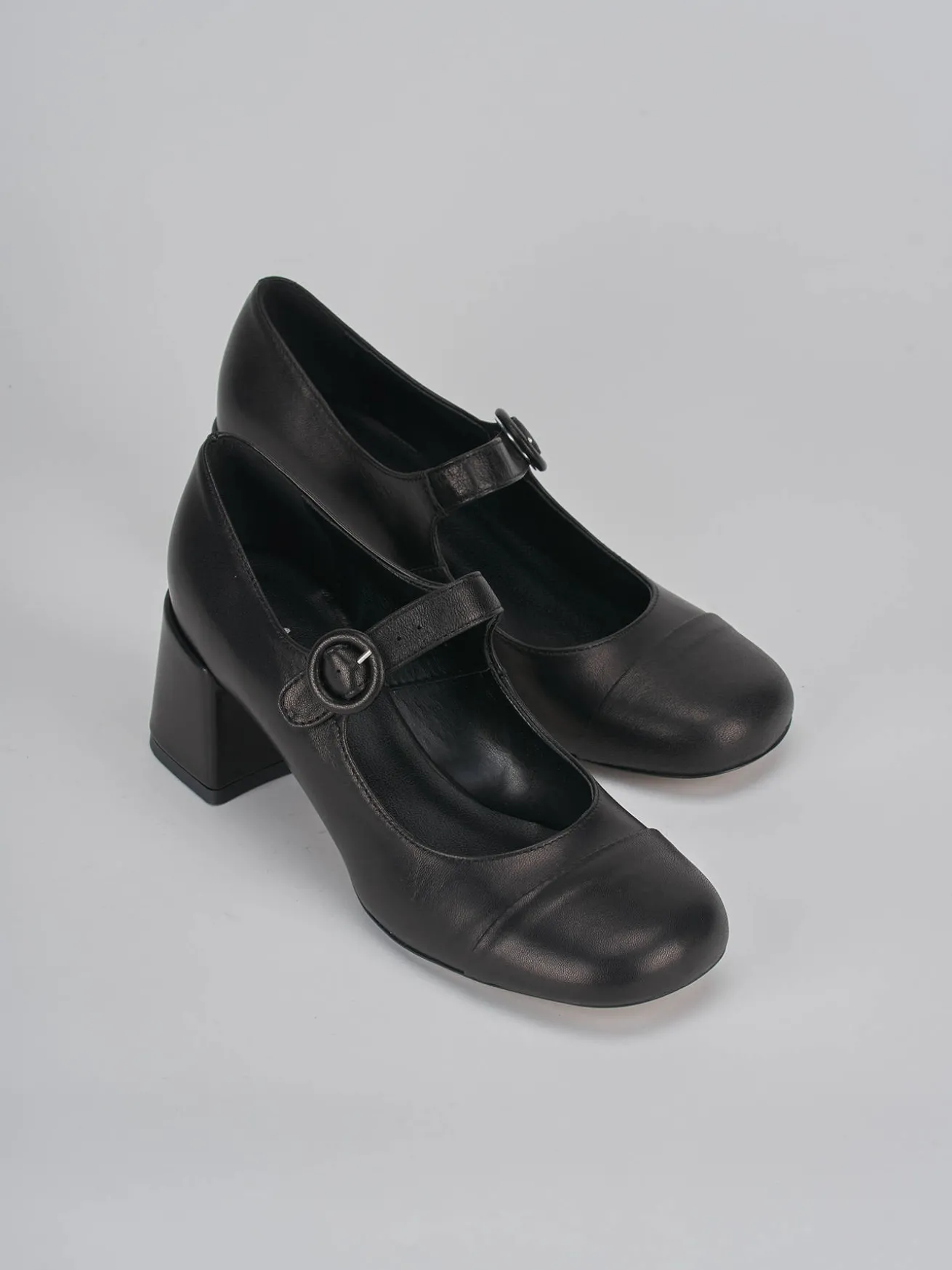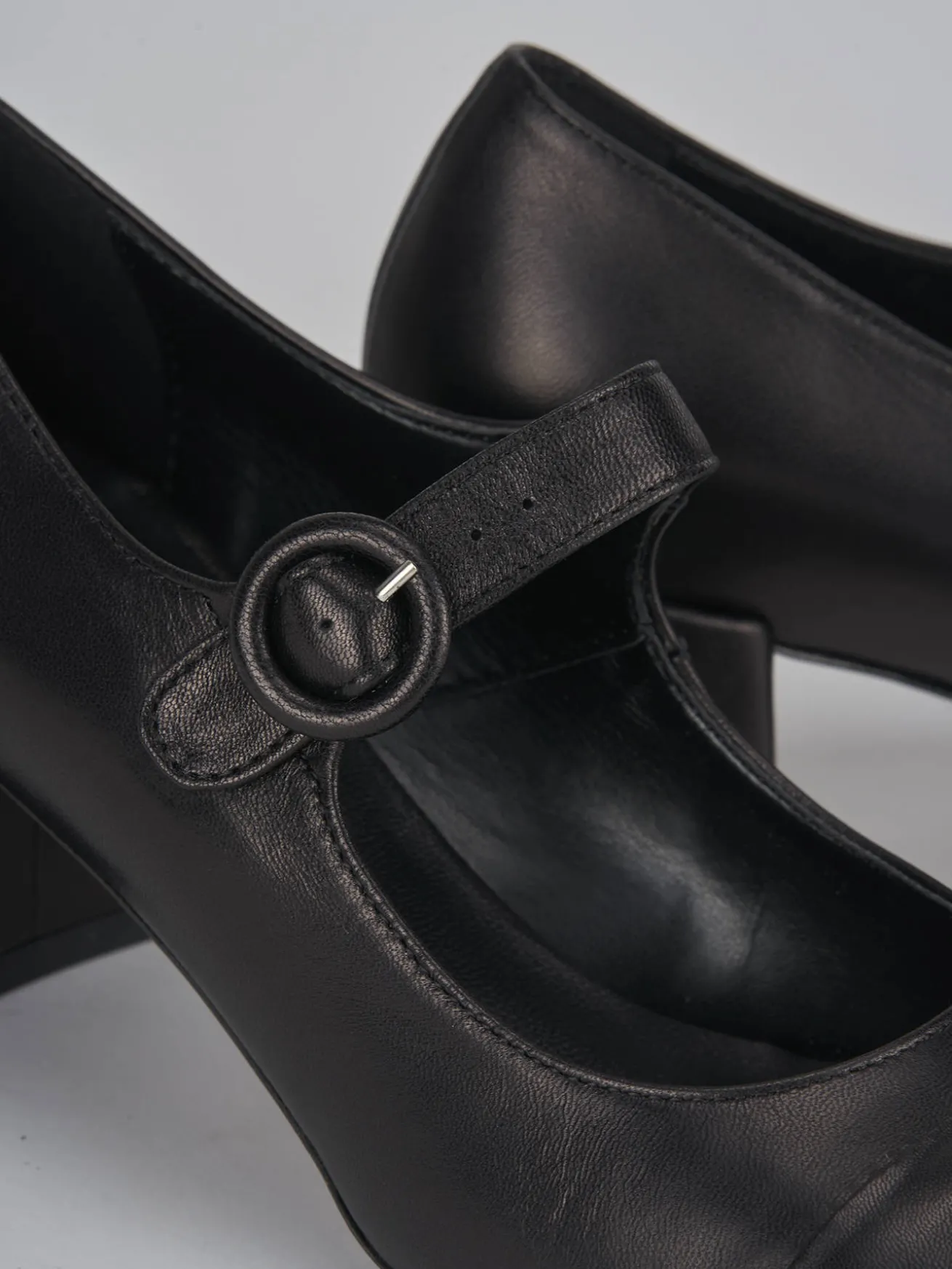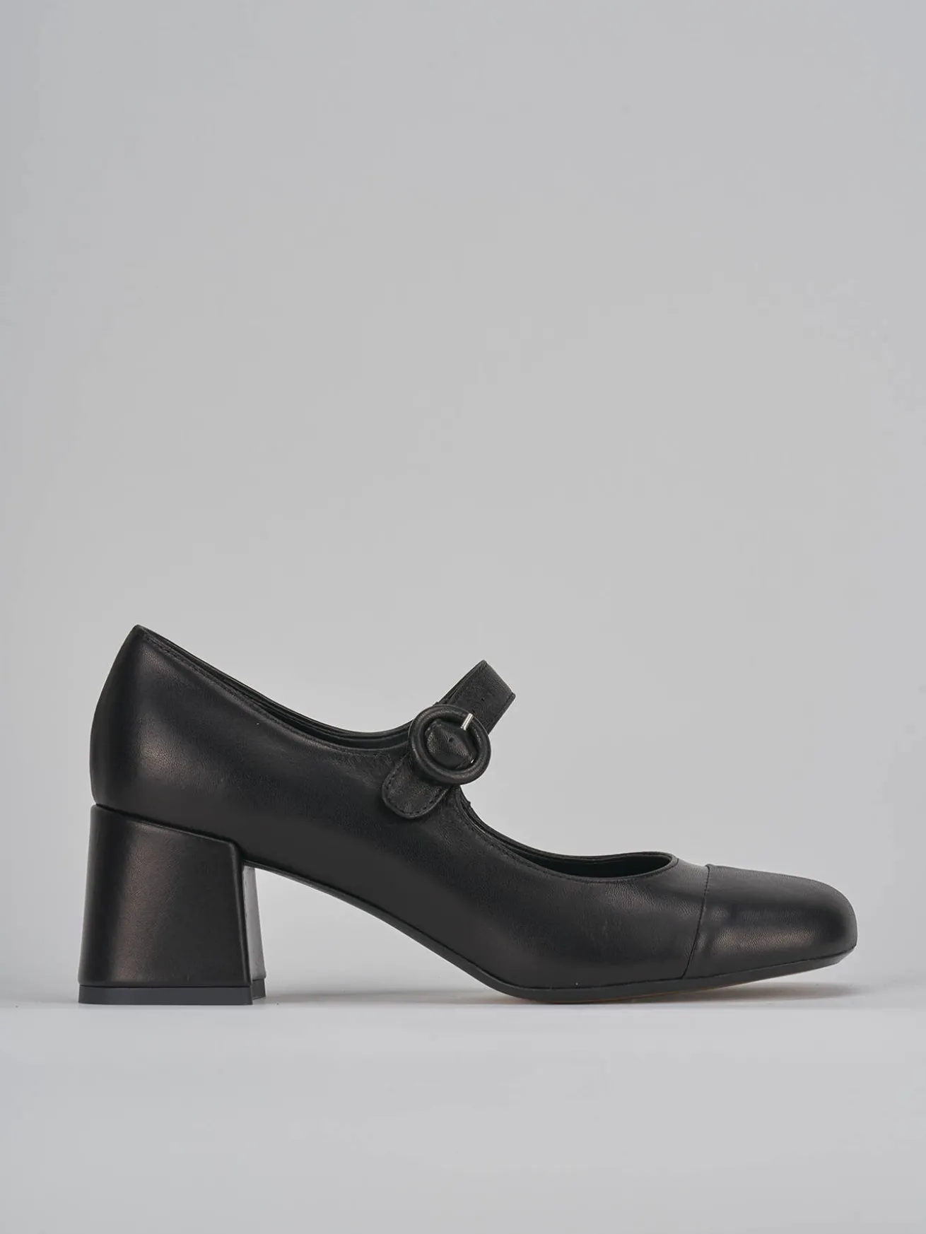 Bebè tacco 6 cm fondo in gomma e soletto interno in vera pelle. Tomaia in morbida pelle nappata, punta leggermente squadrata, puntale ton sur ton, cinturino regolabile e tacco grosso per un look cool.