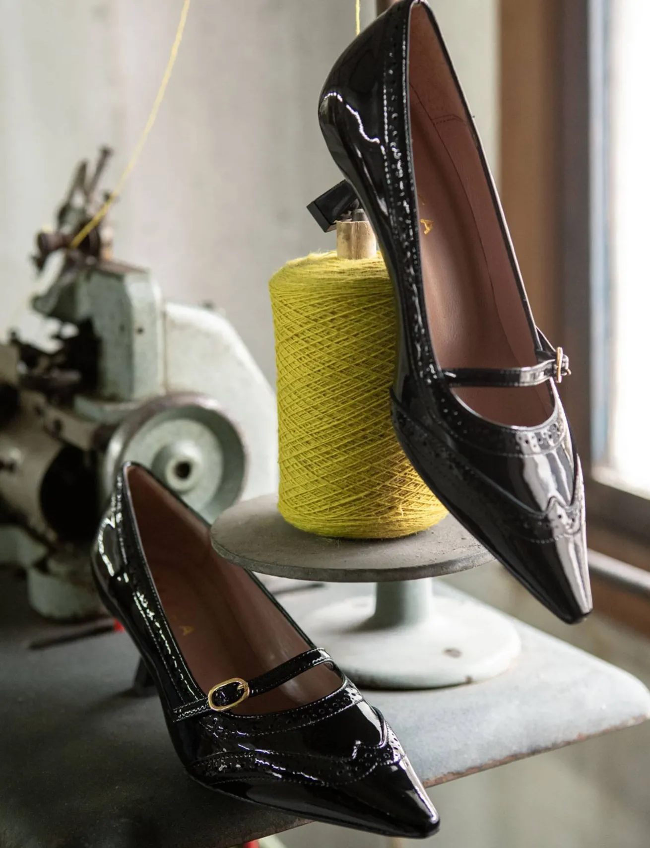 La tomaia in morbida pelle effetto verniciato, abbinata a una punta sfilata e a uno scollo a ‘U’, dona un tocco di classe e raffinatezza.