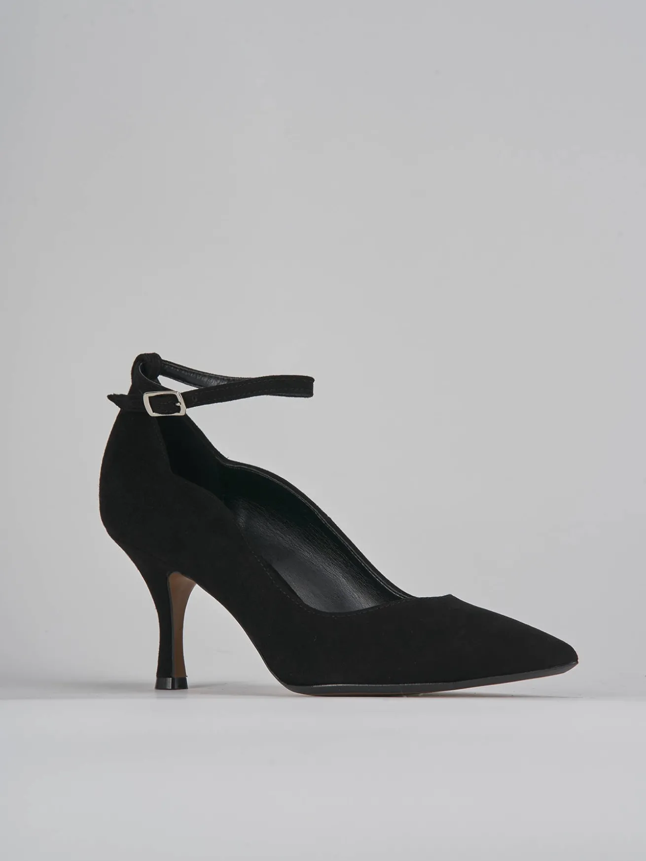 Bebè tacco 7 cm fondo in gomma e soletto interno in vera pelle. Tomaia in morbido camoscio, punta sfilata, orlo svasato, cinturino regolabile in caviglia e nuovissimo tacco rocchetto per un look cool.