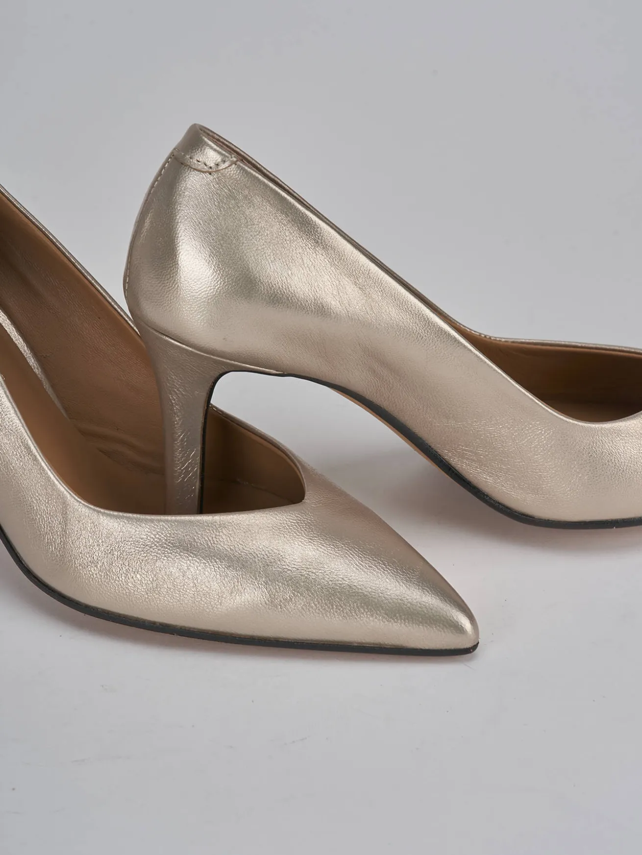 Decoltè tacco 7 cm fondo in cuoio e soletto interno in vera pelle. Tomaia in morbida pelle laminata, punta sfilata, apertura a ‘V’ sulla punta del piede, tacco classico per un look che non passa mai di moda.