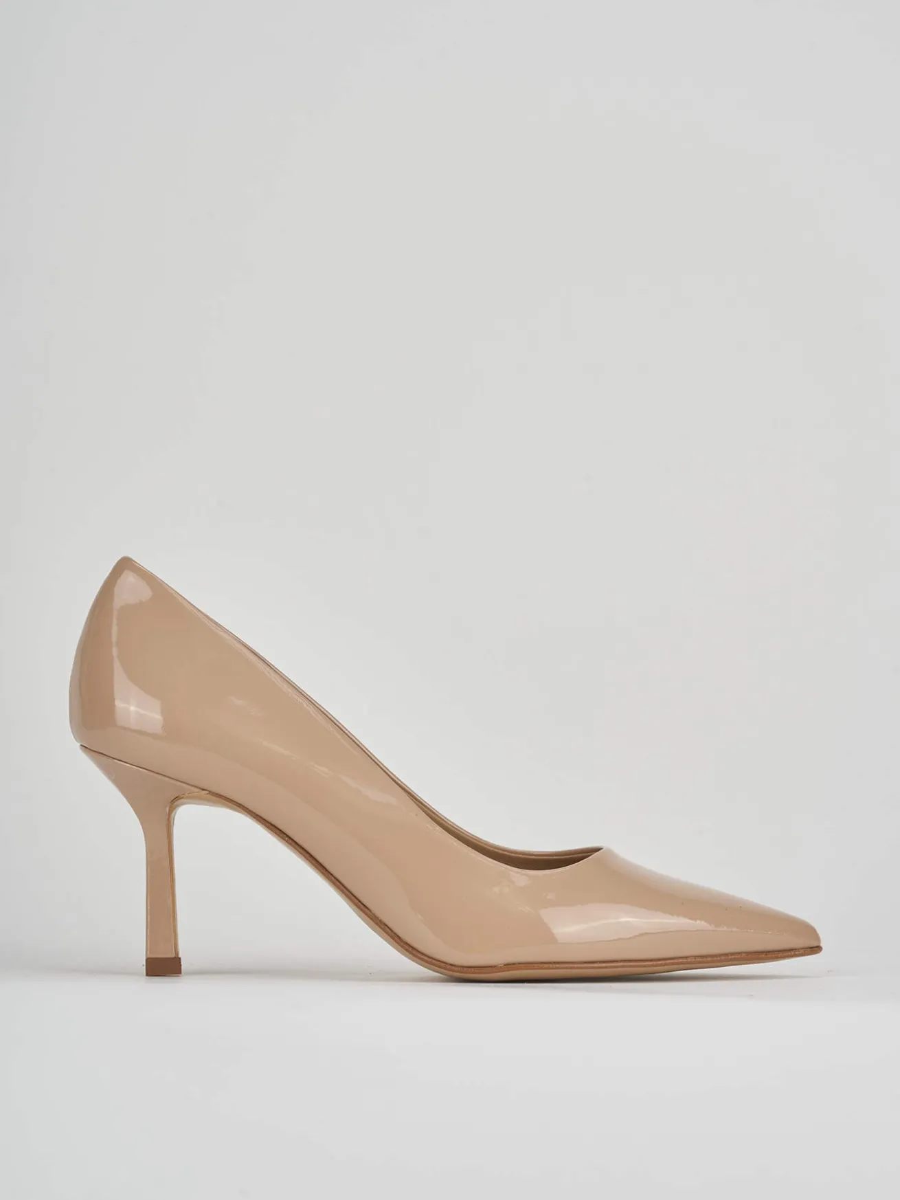 La tomaia in morbida pelle verniciata si distingue per la sua lucentezza raffinata, mentre la punta sfilata conferisce un aspetto moderno e sofisticato.