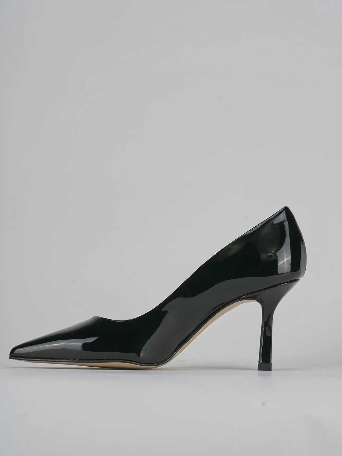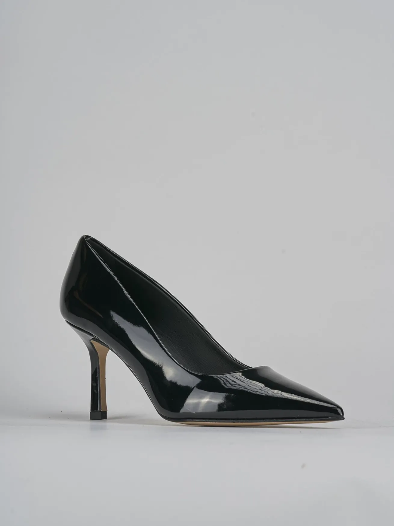 La tomaia in morbida pelle effetto verniciato dona un look sofisticato e moderno, mentre la punta sfilata e lo scollo squadrato aggiungono un dettaglio chic e ricercato.