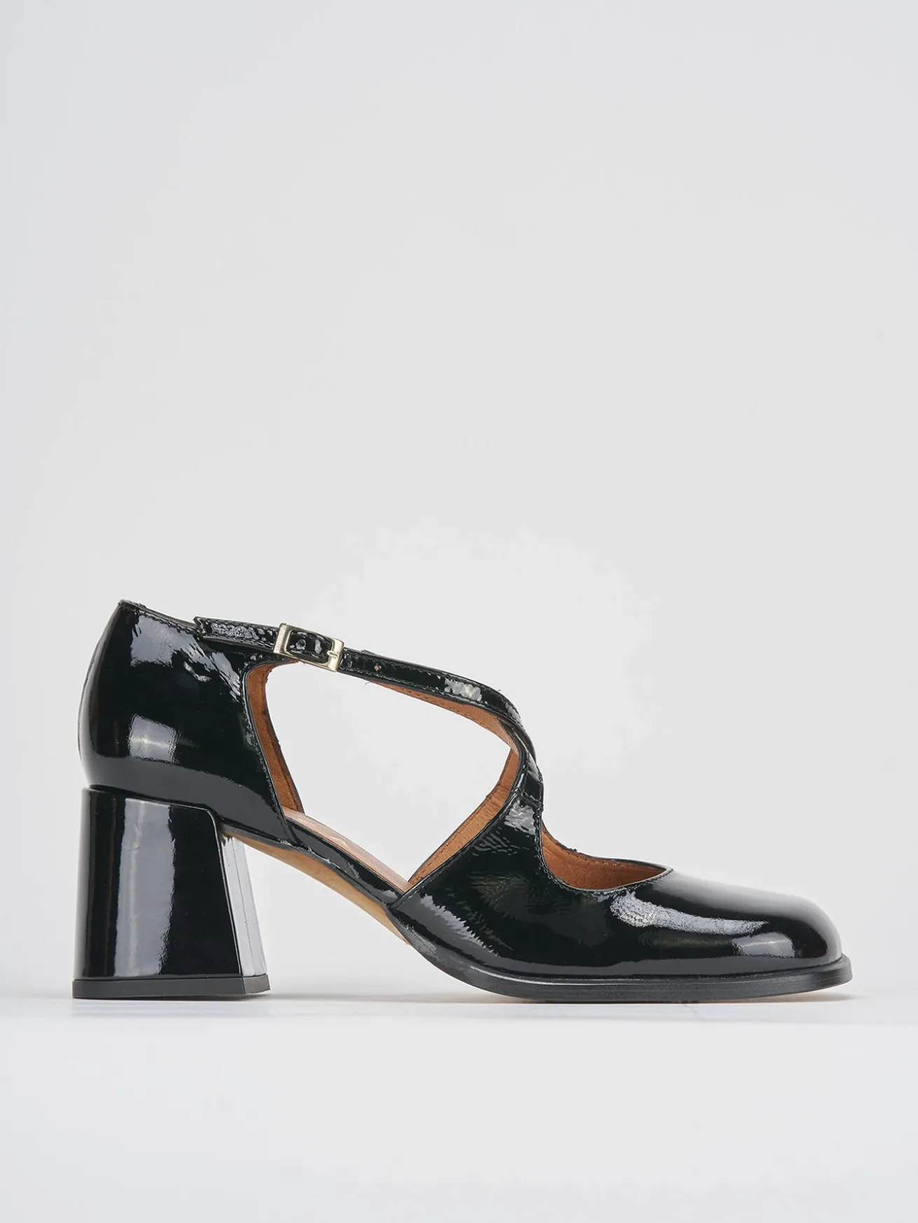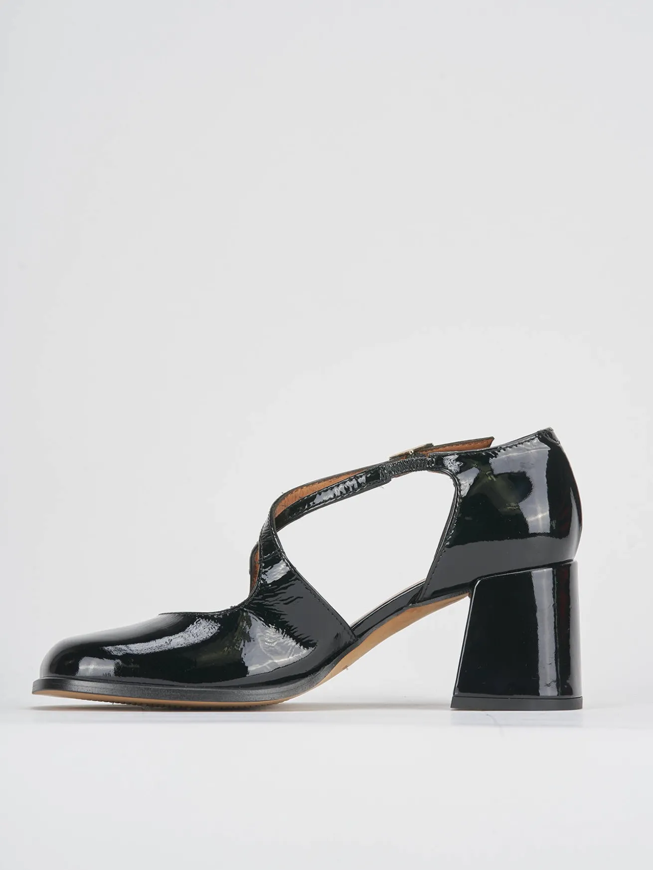 bebe’ tacco 8 cm fondo in leggerissima gomma e soletto interno in vera pelle. tomaia in morbida pelle effetto verniciato, punta squadrata, apertura svasata, fasce incrociate con cinturino regolabile. perfetto con un vestito o una gonna.