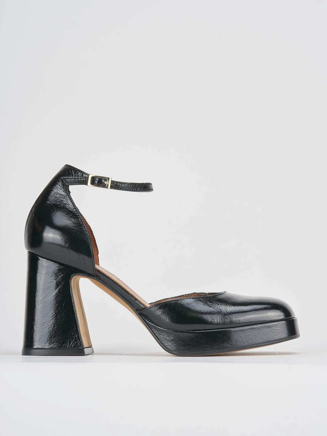 bebe’ tacco 9 cm fondo in gomma e soletto interno in vera pelle. tomaia in morbida pelle effetto verniciato, punta leggermente affusolata, con apertura svasata, plateau di un 1 cm sulla parte anteriore, cinturino in caviglia regolabile e tacco grosso per un look cool.