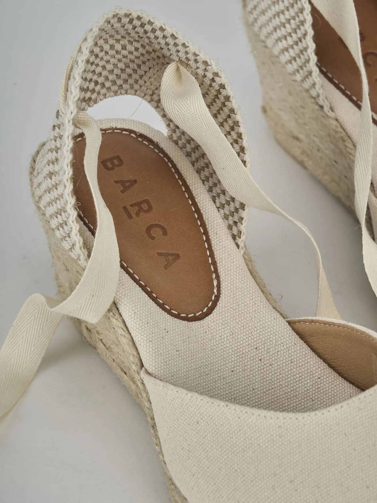 Espadrillas zeppa 6 cm fondo in leggera gomma e soletto interno in tessuto. tomaia in morbido tessuto, apertura a giro sul collo del piede, tallone chiuso e chiusura con nastro tessuto a schiava per un look chic!