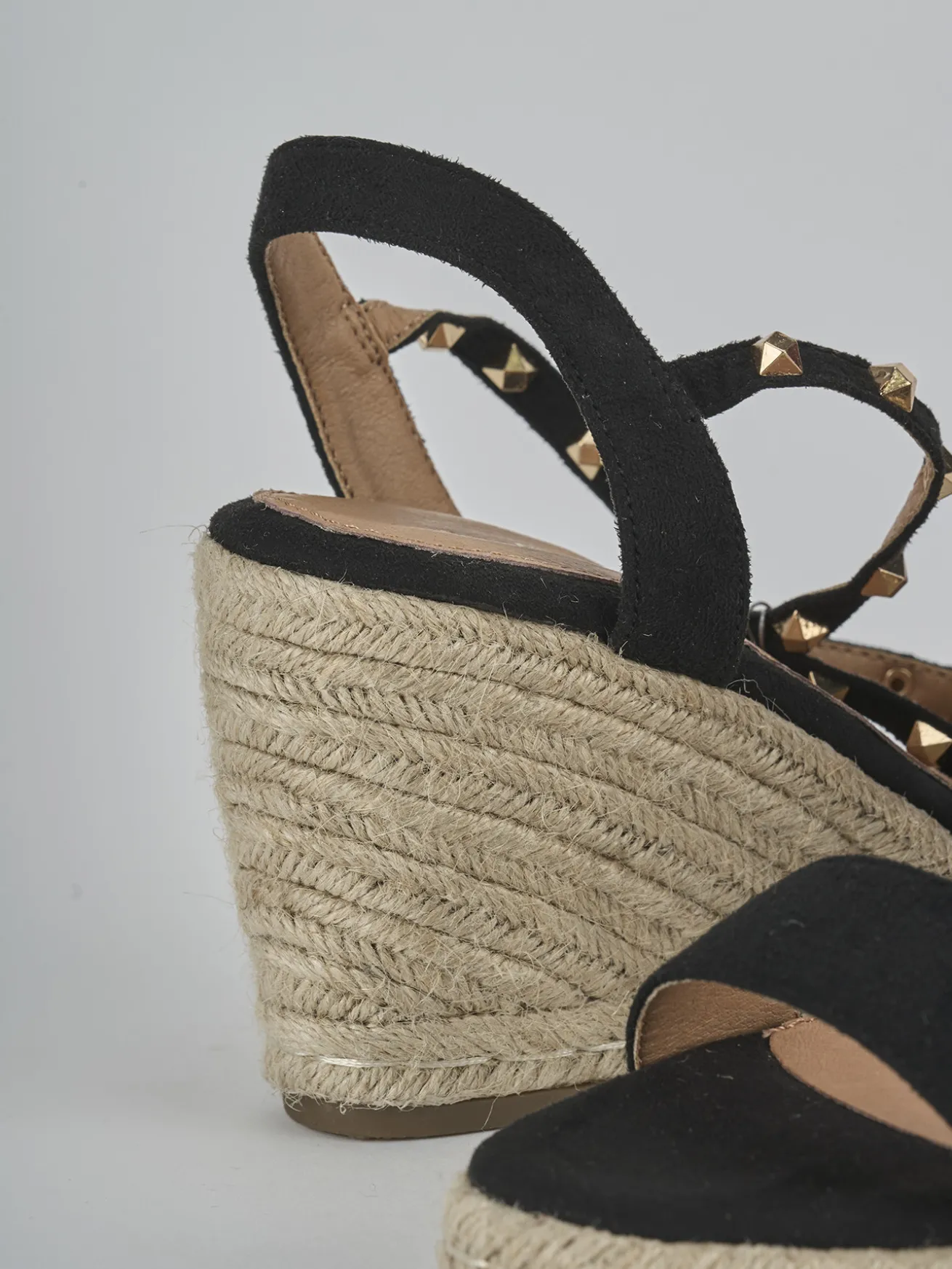 Espadrilla zeppa 9 cm fondo in gomma e soletto interno in vera pelle. Tomaia in morbido camoscio sostenibile, punta affusolata, fascia unica in punta, cinturino a incrocio con fibbia regolabile e borchie per un look chic. Piccolo plateau di 1 cm anteriore.