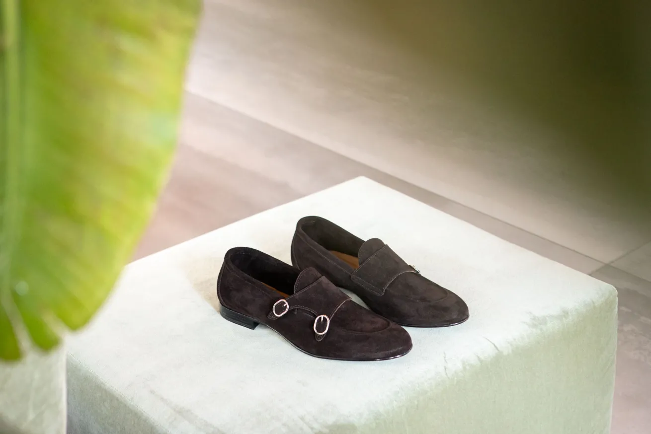 Realizzati in morbido camoscio, questi mocassini monkstrap presentano una raffinata punta affusolata e una chiusura con due fibbie regolabili, che aggiungono un tocco di classe al tuo look quotidiano.