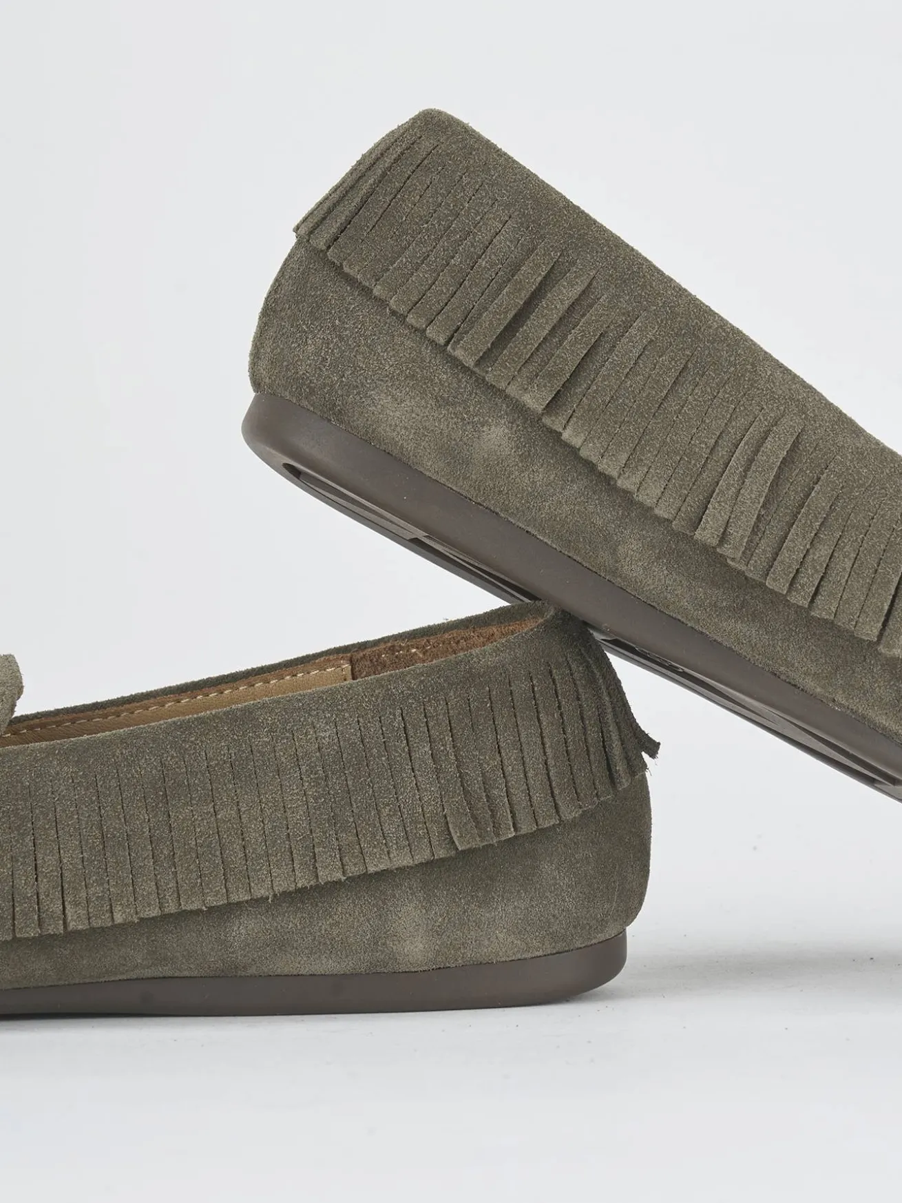 Realizzati in morbido camoscio, questi mocassini presentano dettagli di frange sul bordo superiore, aggiungendo un elemento di stile sofisticato.