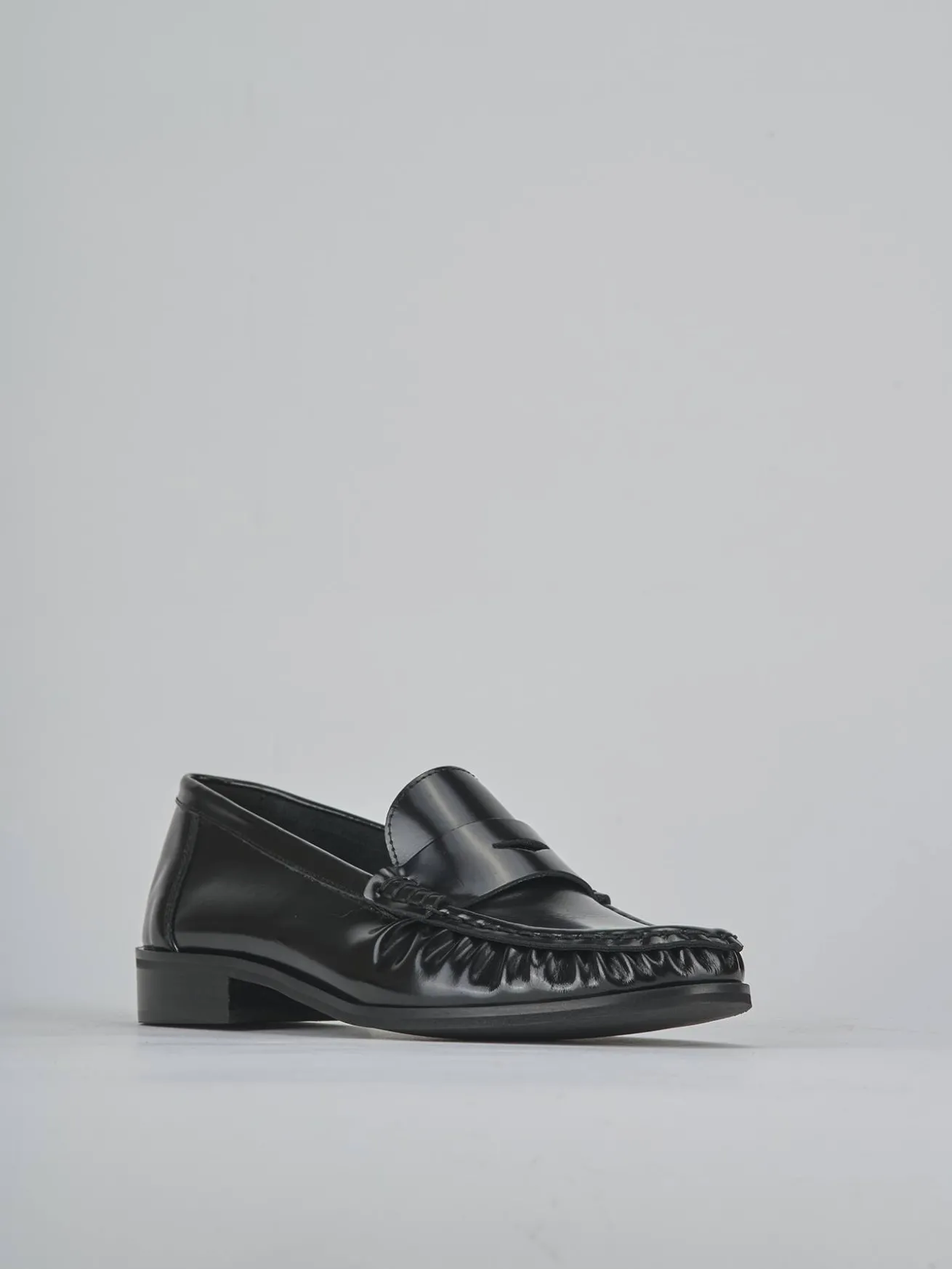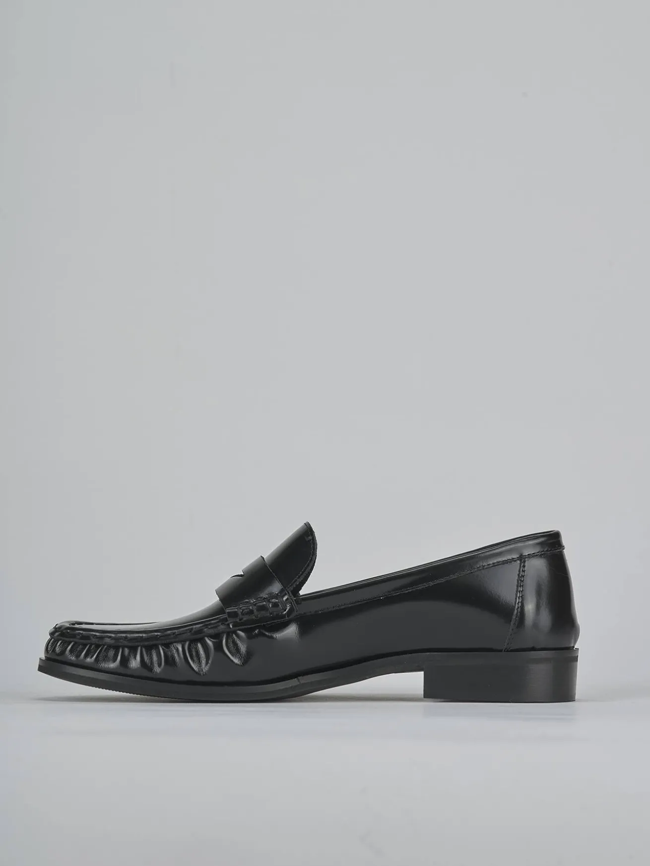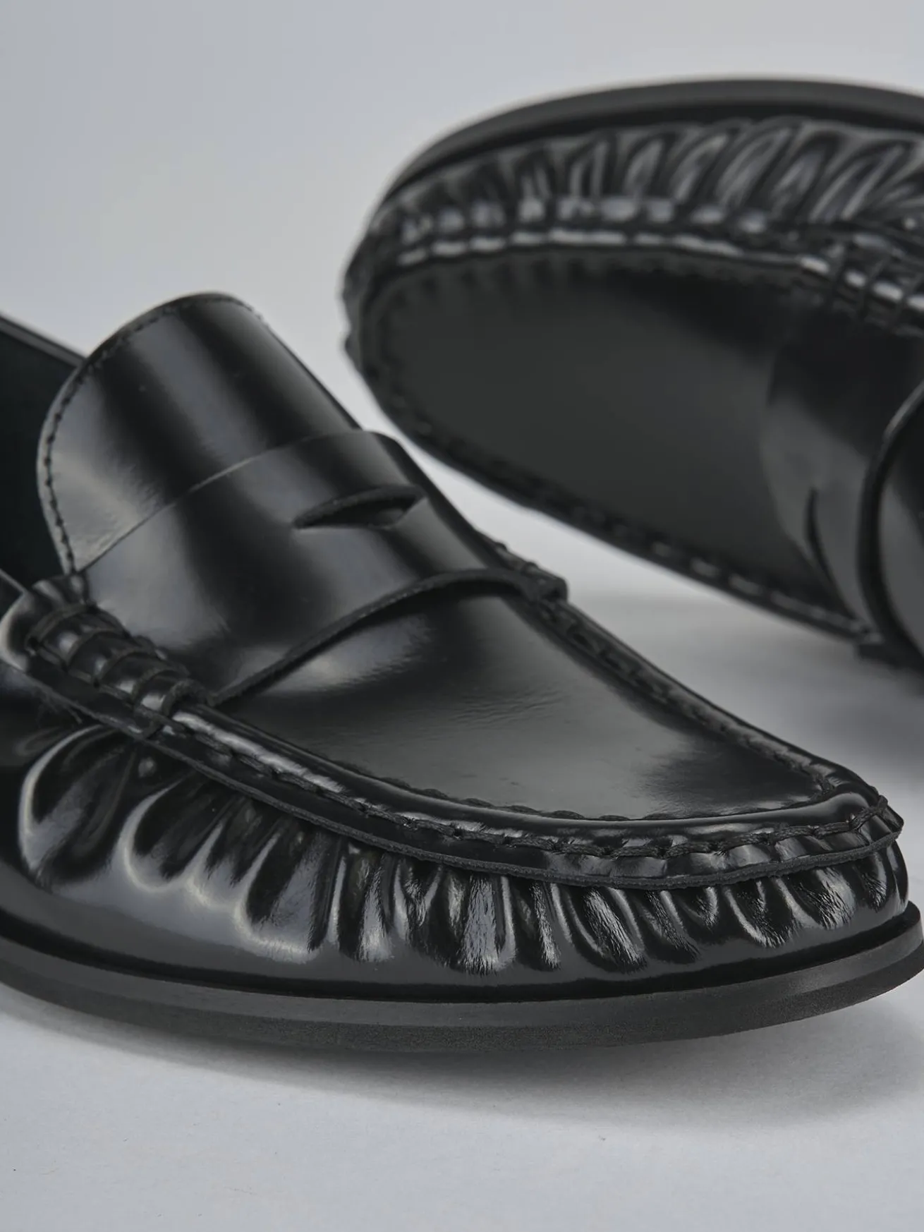 Realizzati in morbida pelle abrasivata, presentano una punta affusolata e dettagli di cuciture a mano che ne esaltano l’artigianalità.