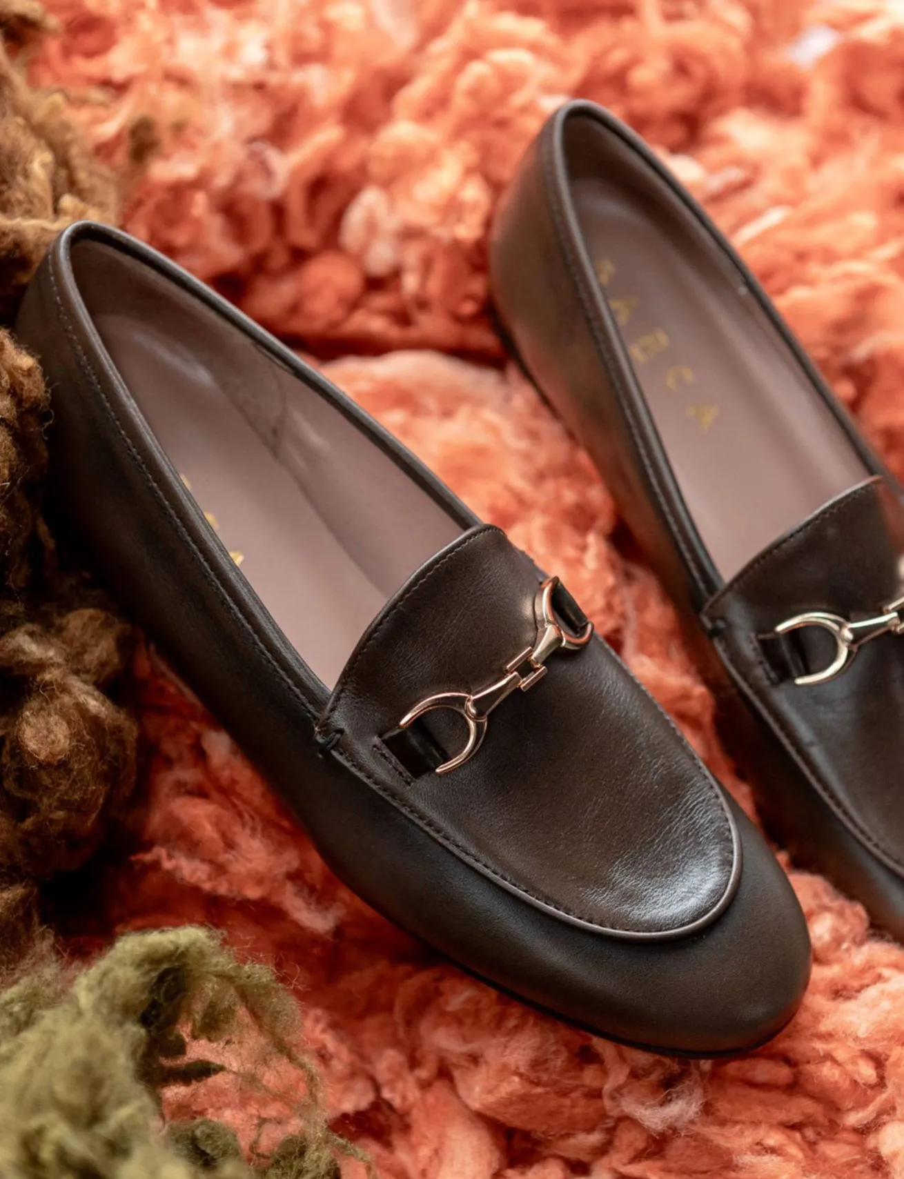 La punta leggermente squadrata e le cuciture a vista aggiungono un tocco di sofisticatezza, mentre il morsetto dona un dettaglio di classe.