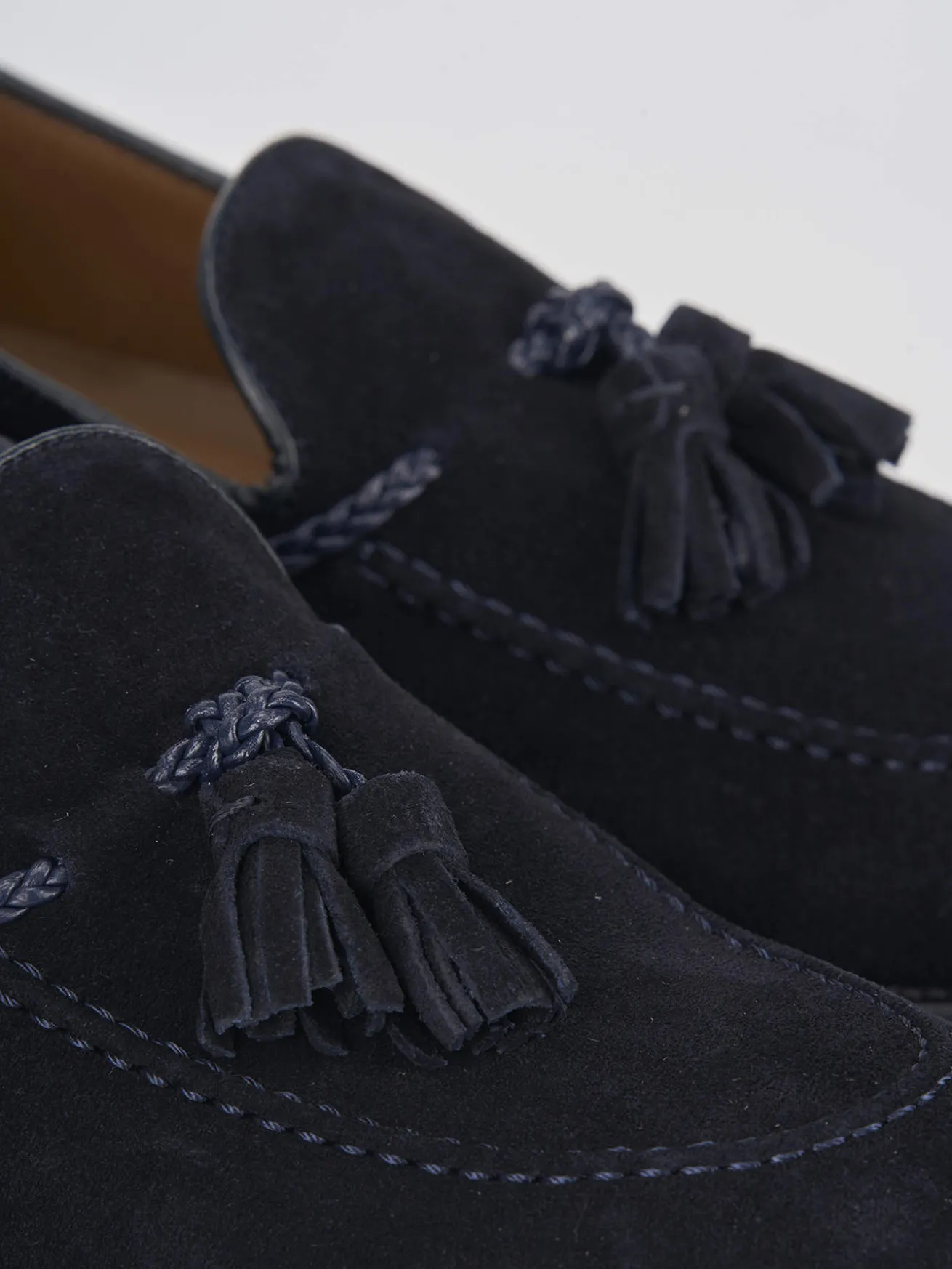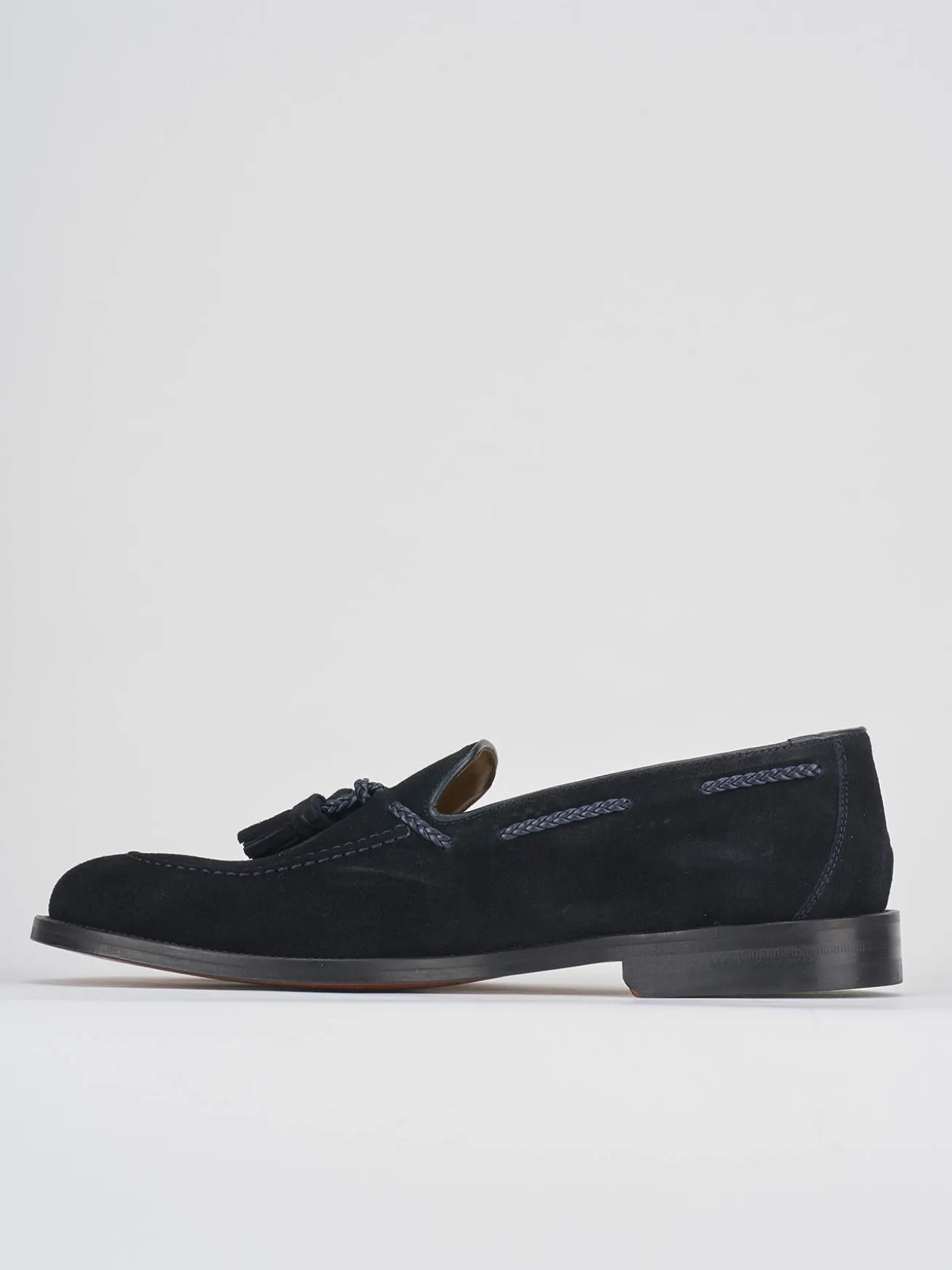 mocassino fondo in cuoio e soletto interno in vera pelle. Tomaia in morbidissimo camoscio con particolarissimo bordo con treccina in pelle e nappina sul collo del piede. English style!