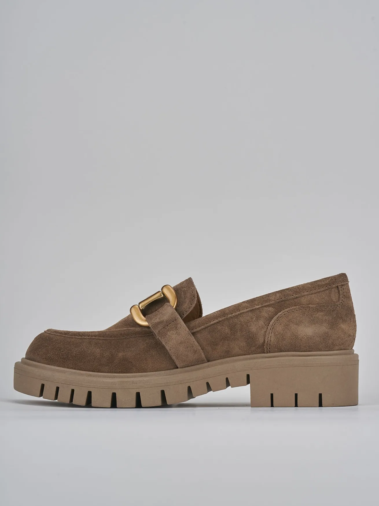 Mocassino tacco 2 cm fondo in gomma e soletto interno in vera pelle. Tomaia in morbido camoscio, punta leggermente squadrata, cuciture visibili, fascette laterali che sorreggono un morsetto per un look chic.