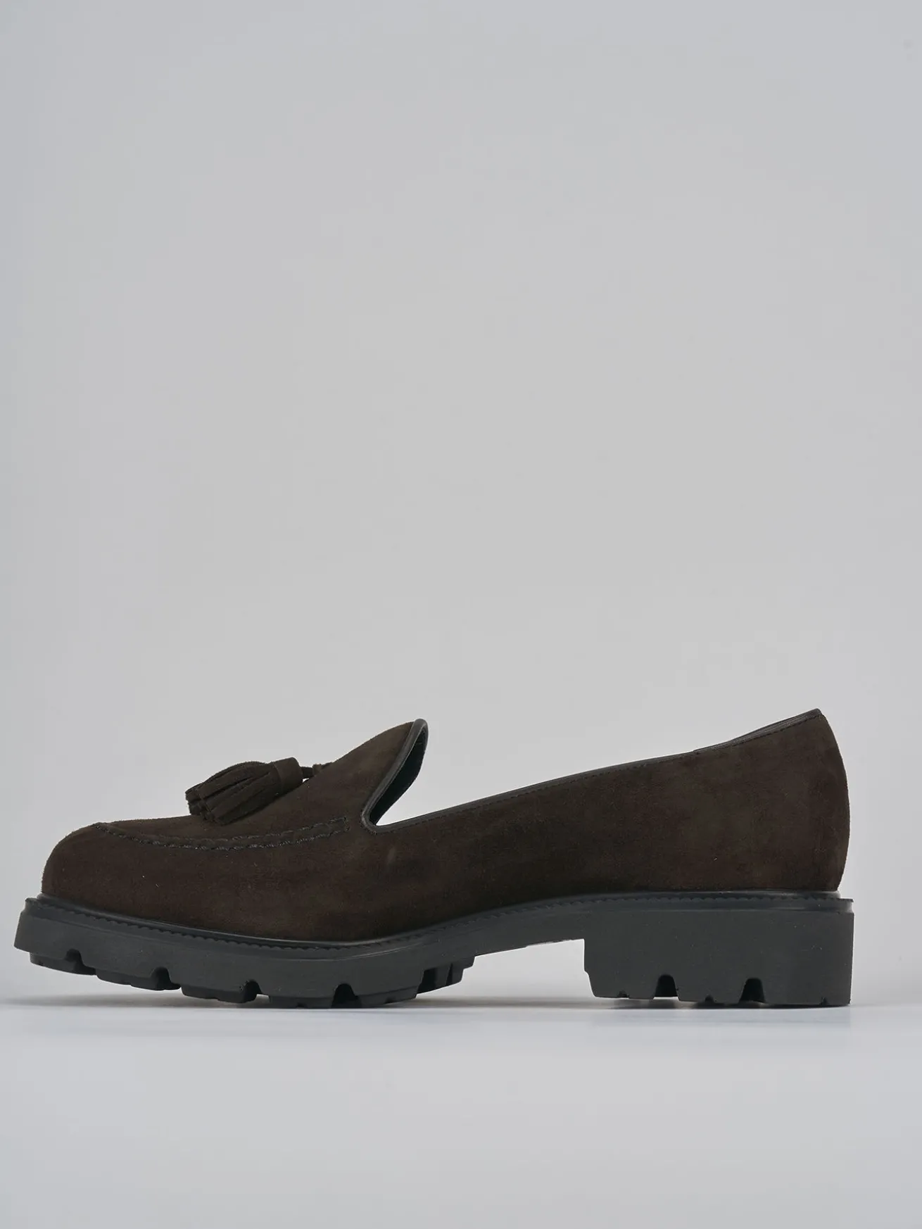 Mocassino tacco 2 cm fondo in gomma e soletto interno in vera pelle. Tomaia in morbido camoscio, punta affusolata, cuciture visibili, nappine e fondo light per un look chic. adatto con dei jeans o un vestito.