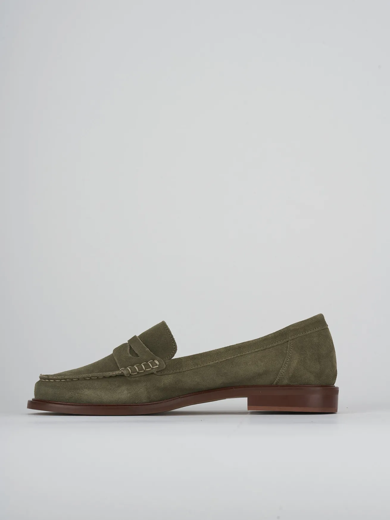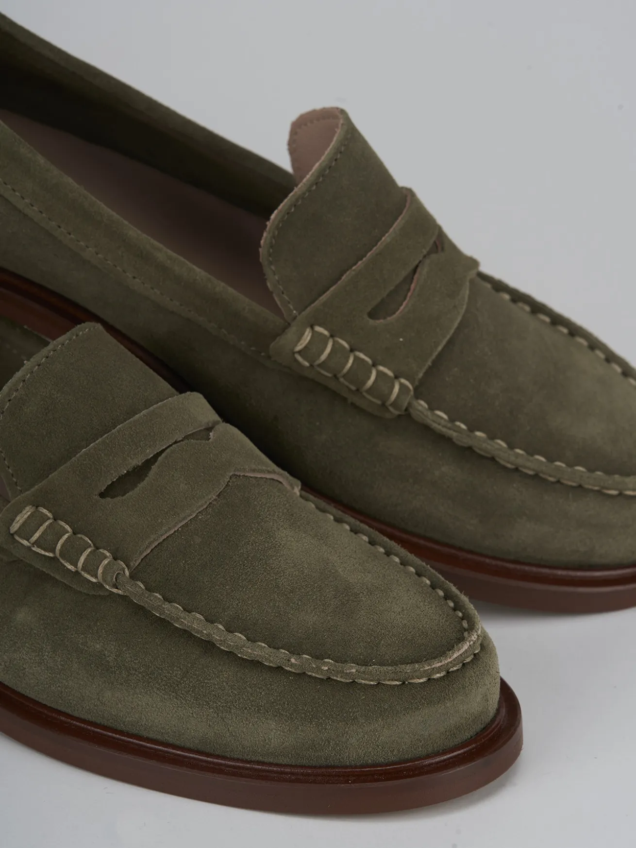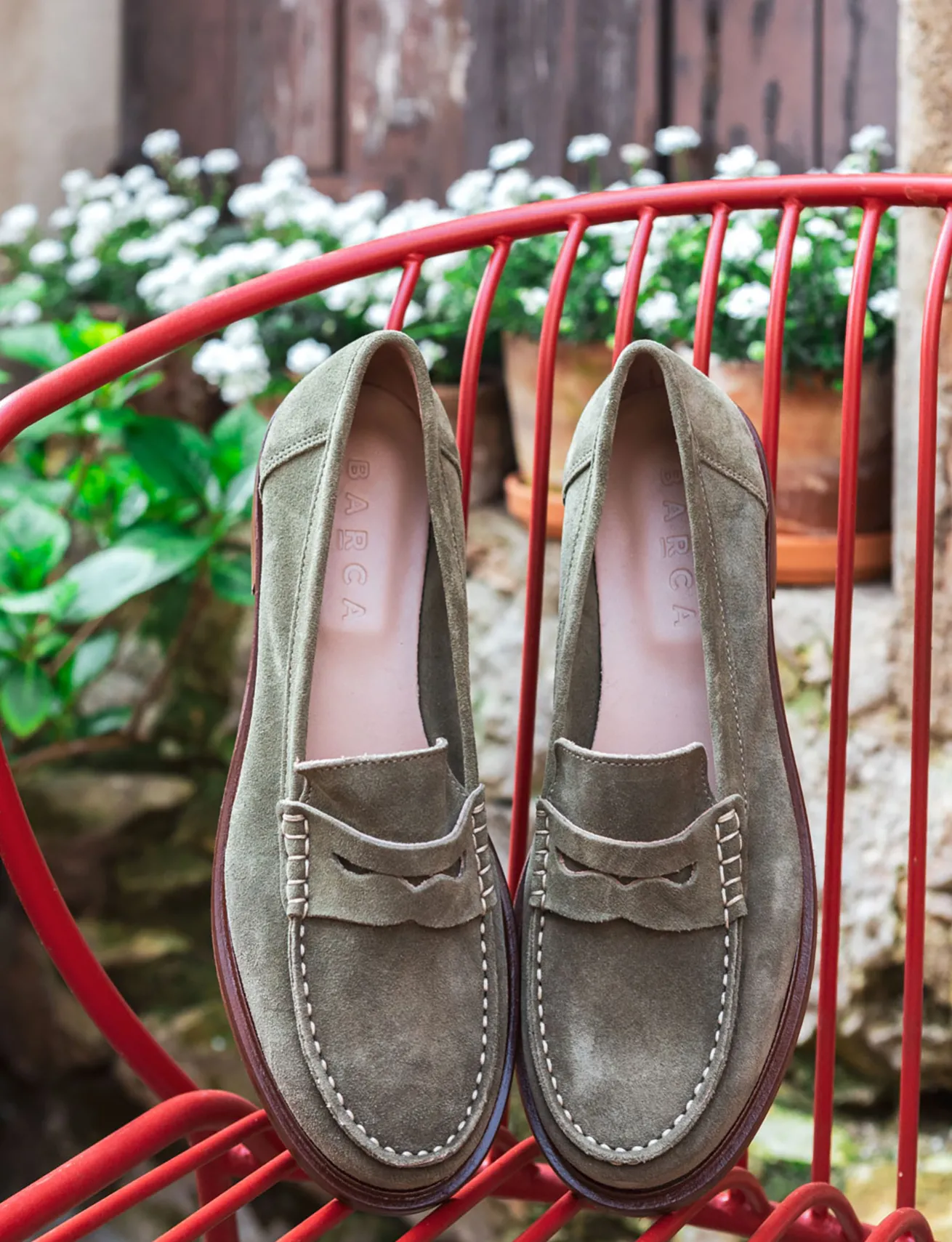 Mocassino tacco 2 cm fondo in leggera gomma e soletto interno in vera pelle. tomaia in morbido camoscio, punta leggermente squadrata, cuciture a mano e in rilievo, mascherina a bocca di leone. Dal design semplice per un look sempre attuale.