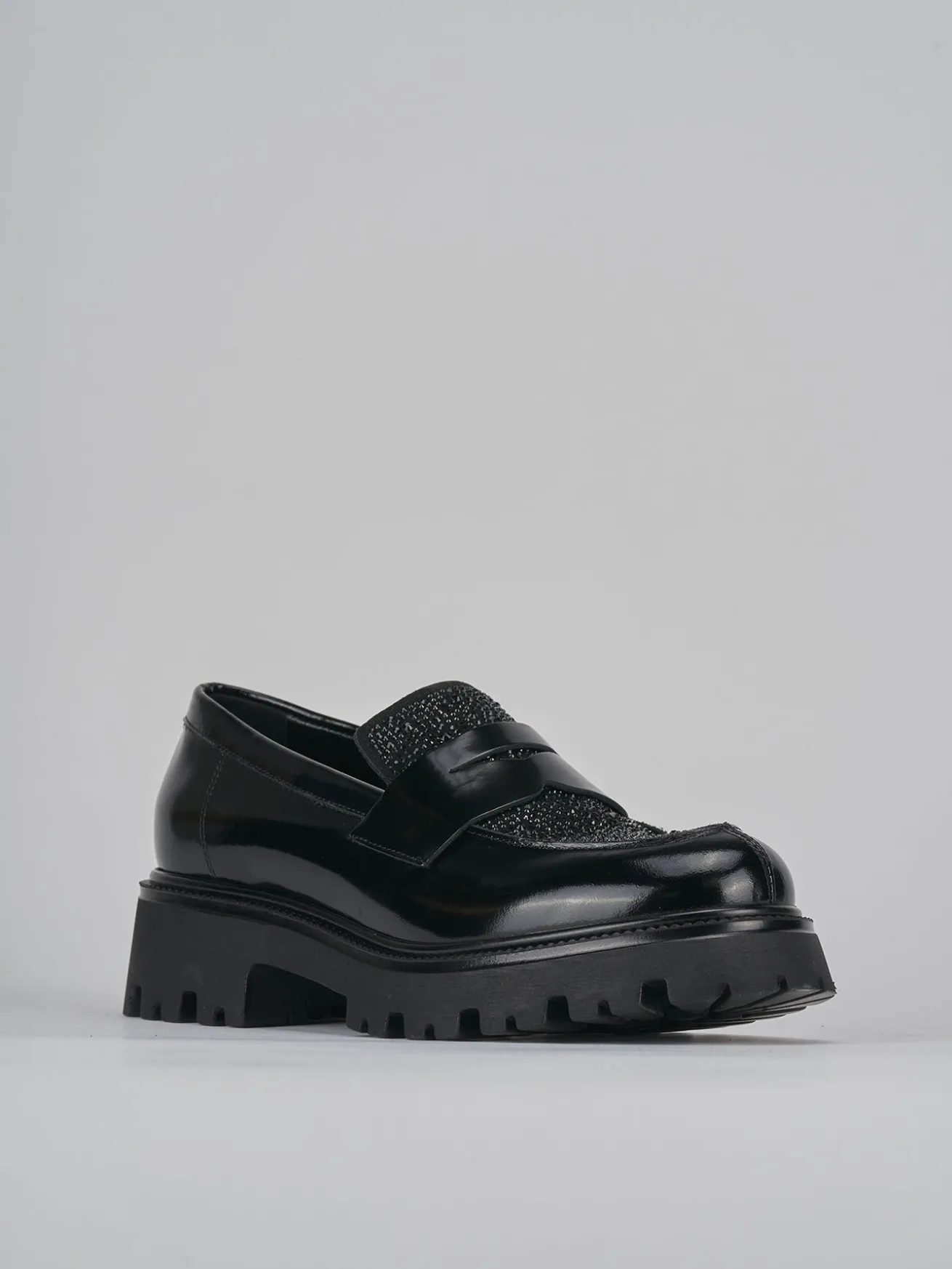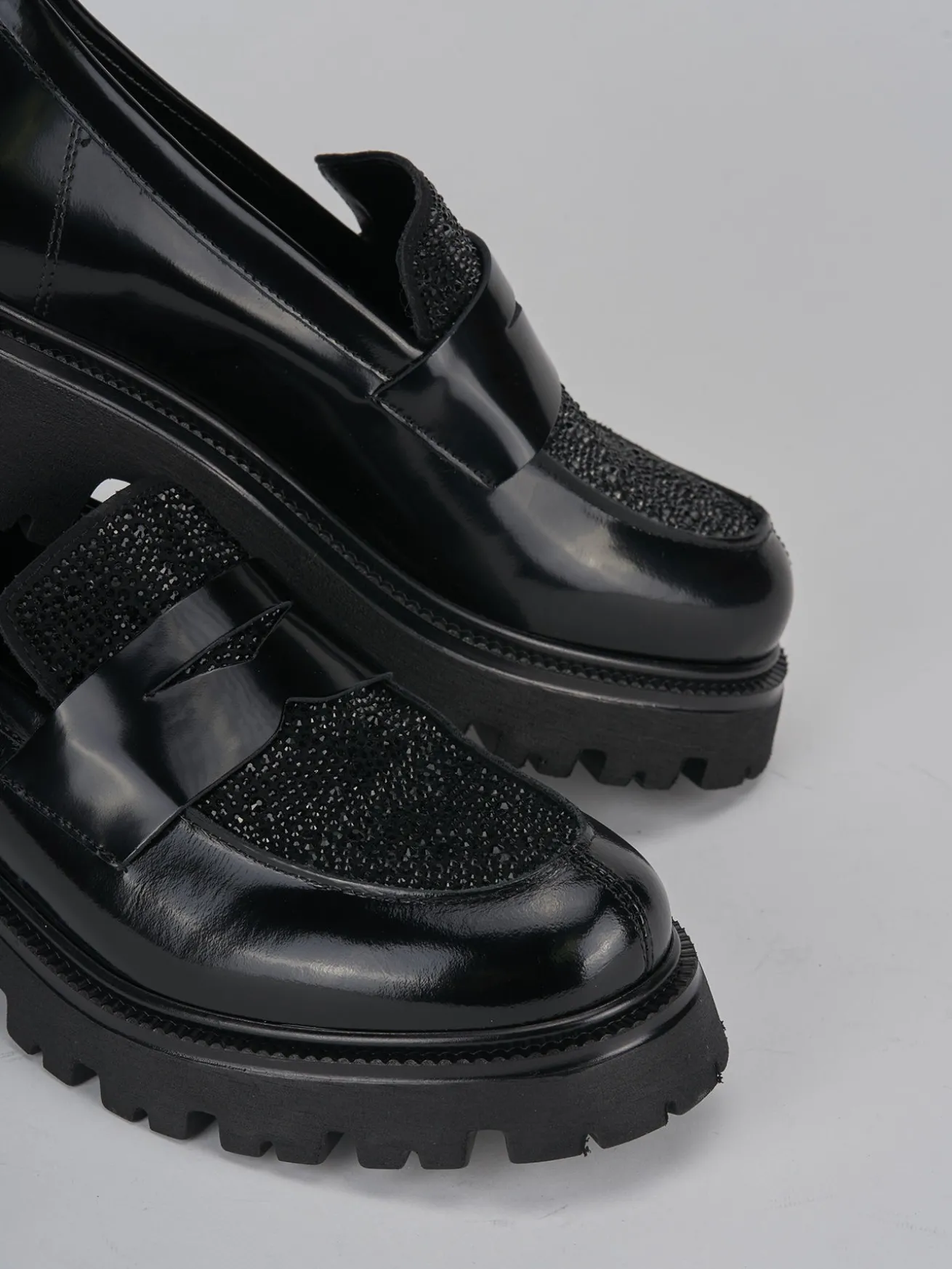 Realizzati con una raffinata tomaia in pelle abrasivata effetto lucido, questi mocassini catturano l’attenzione con la loro punta leggermente squadrata arricchita da strass scintillanti.