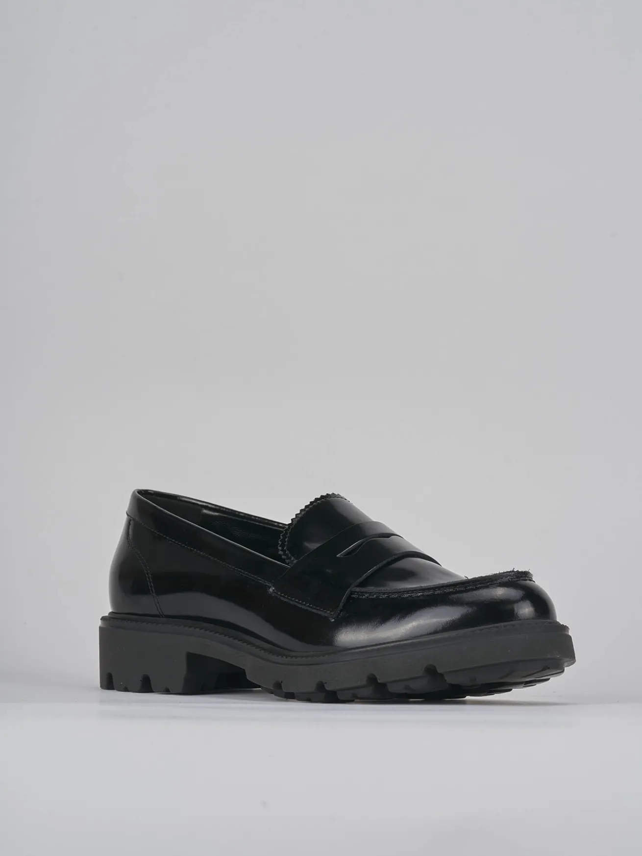 Mocassino tacco 2 cm fondo in gomma e soletto interno in vera pelle. Tomaia in morbida pelle abrasivata effetto lucido, cuciture ben visibili, mascherina a bocca di leone e linguetta seghettata per un look cool.