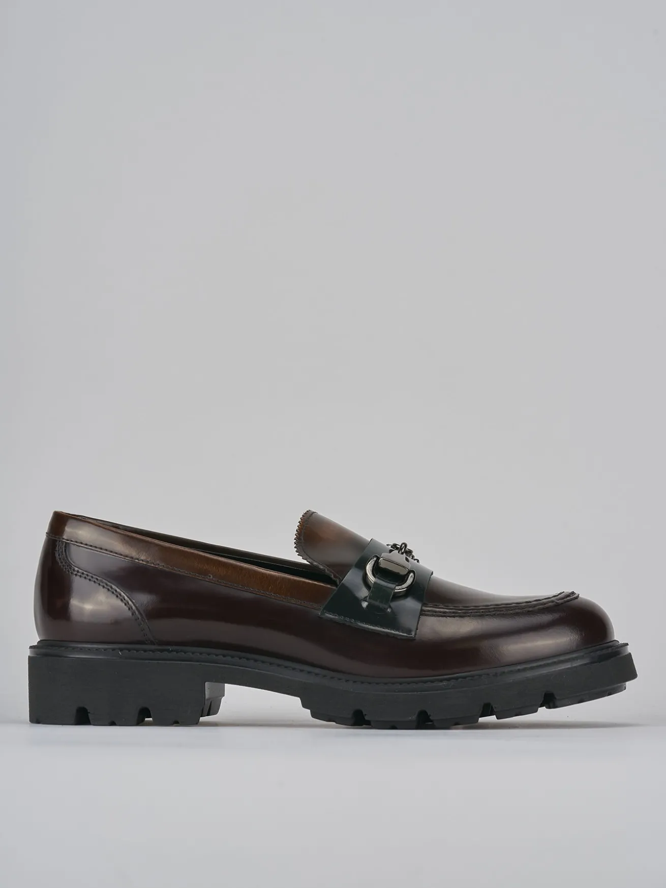 Mocassino tacco 2 cm fondo in gomma e soletto interno in vera pelle. Tomaia in morbida pelle abrasivata lucida, punta leggermente squadrata, cuciture ben visibili, mascherina in contrasto con la tomaia, morsetto e particolare fondo extra light per un look cool.