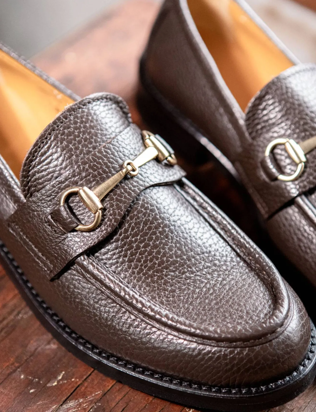 Le cuciture visibili alla norvegese e il morsetto in metallo dorato conferiscono un carattere distintivo.