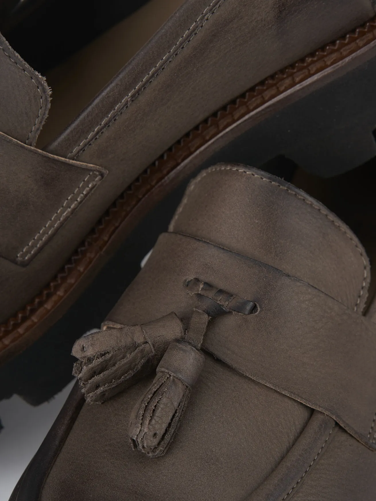 Mocassino tacco 3 cm fondo in gomma e soletto interno in vera pelle. Tomaia in morbido nabuk, punta leggermente squadrata, cuciture a vista, nappine. perfetto con un vestito o un jeans.