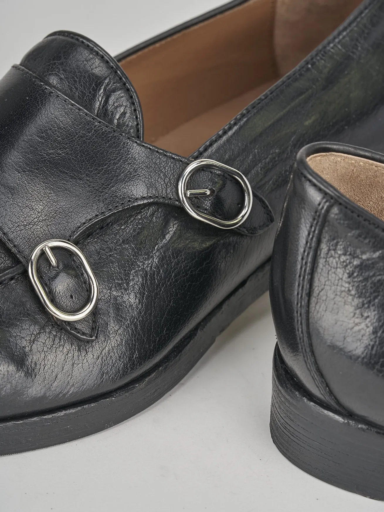 mocassino monk-strap fondo cuoio e soletto interno in vera pelle. tomaia in morbida pelle, punta leggermente ovale, chiusura con due fibbie per un tocco elegante per le tue occasioni speciali.