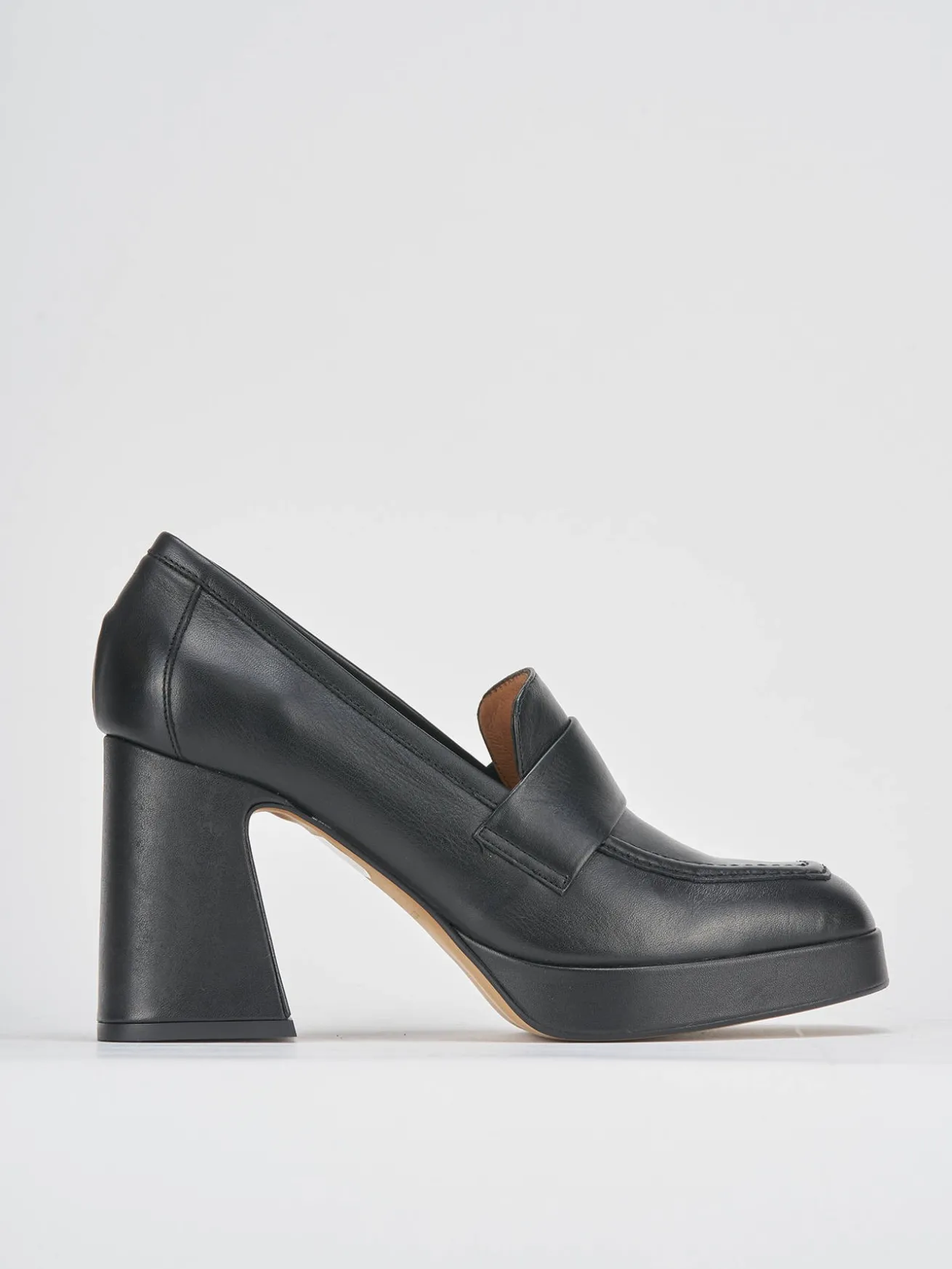 mocassino tacco 8 cm fondo in gomma e soletto interno in vera pelle. tomaia in morbida pelle, punta leggermente squadrata, plateau di 1.5 cm sulla parte anteriore, cuciture a mano, mascherina e tacco grosso per una camminata sicura.