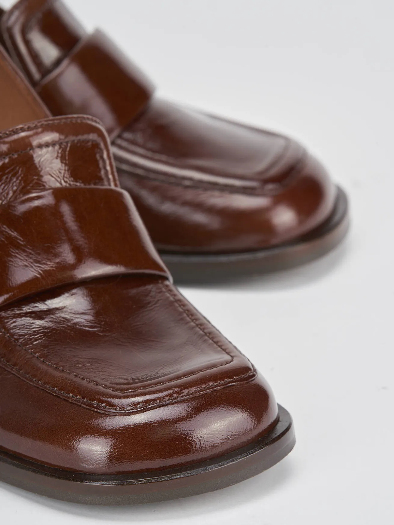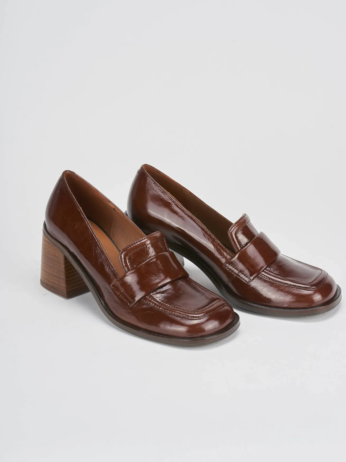 mocassino tacco 8 cm fondo in gomma e soletto interno in vera pelle. tomaia in morbida pelle effetto verniciato, punta squadrata, cuciture a vista, mascherina rettangolare e tacco in legno per un look chic.