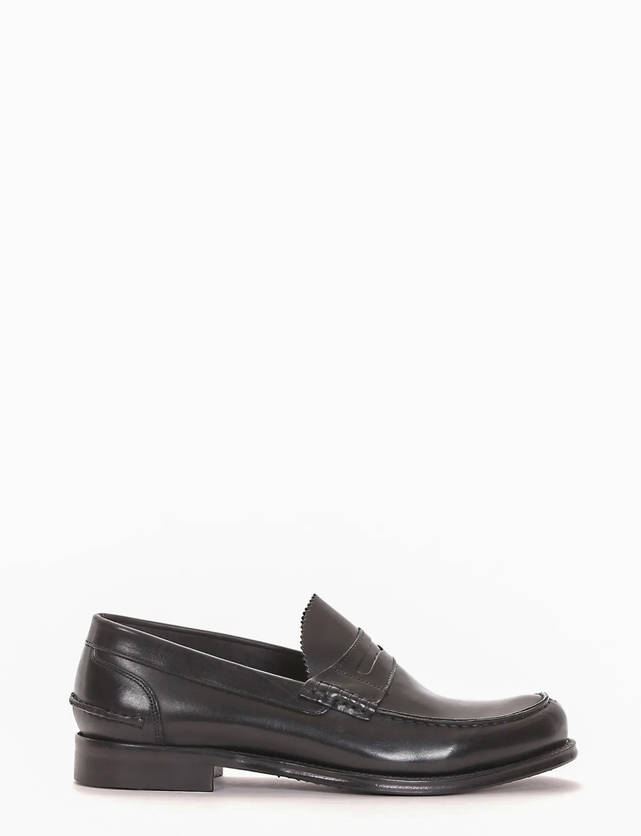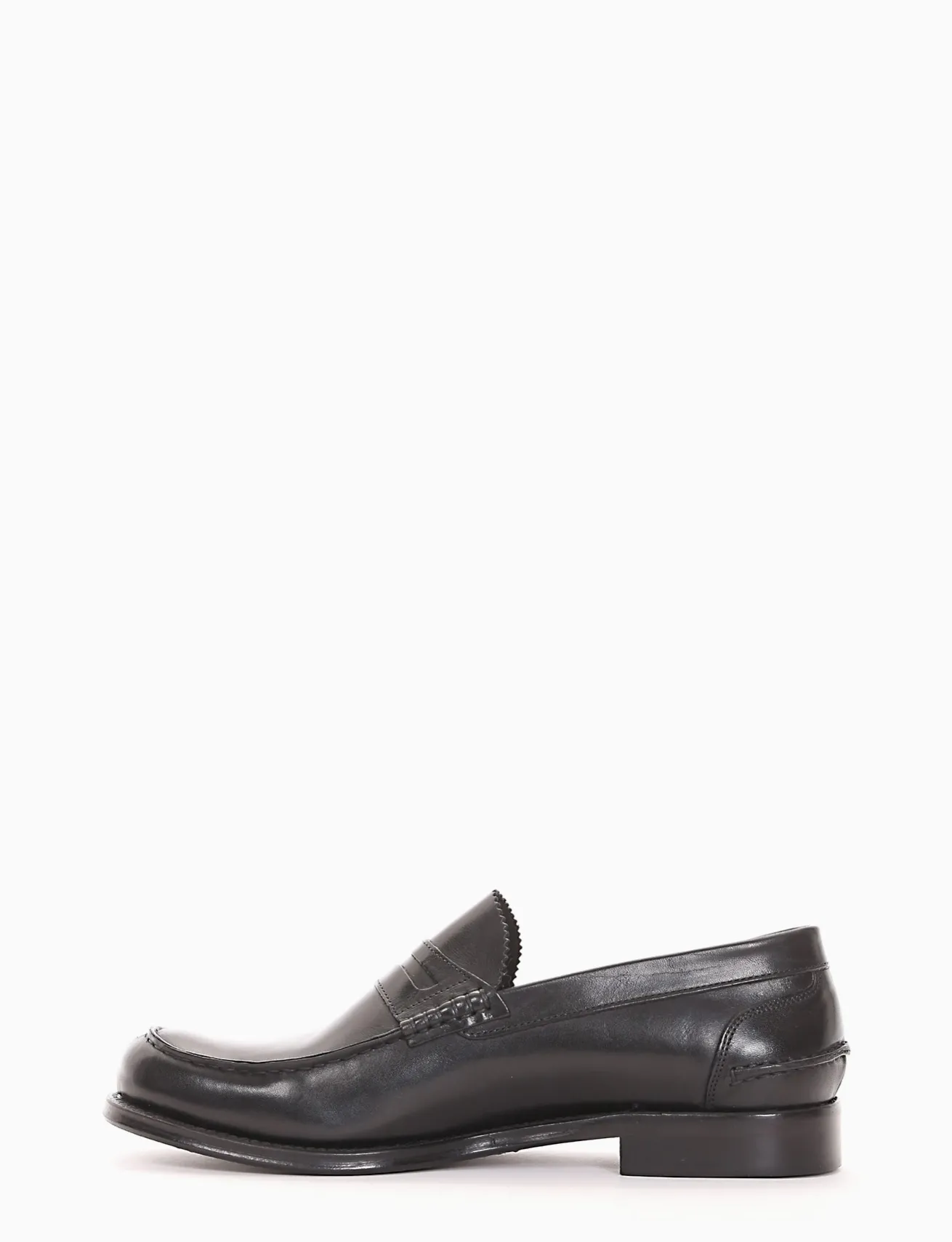 mocassino tacco 2 cm, fondo in cuoio e soletto interno in vera pelle. Tomaia in vitello lucido, modello tipo college con mascherina e cucitura sul bordo.