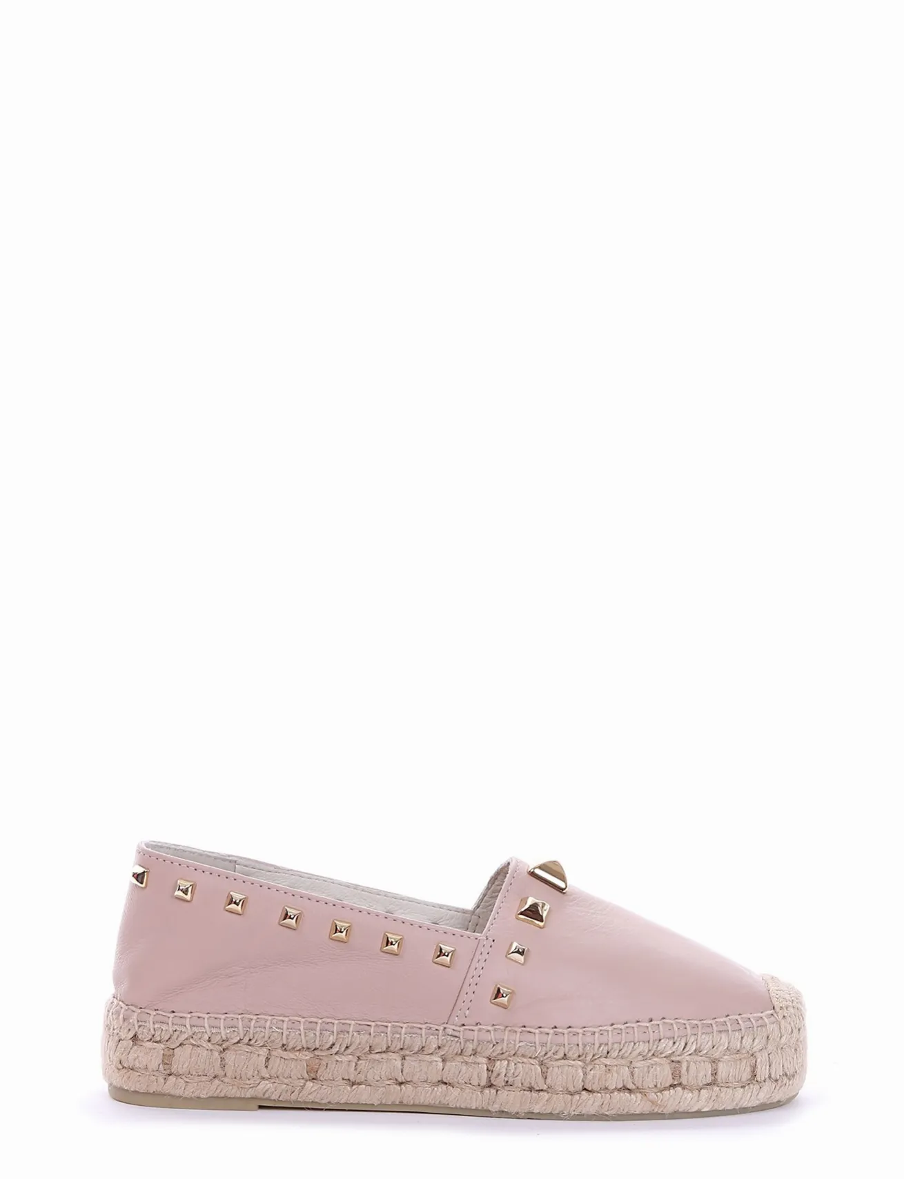 espadrilas fondo in gomma e soletto interno in vera pelle. Tomaia in morbidissima pelle nappata abbellita da piccole borchie color oro punta chiusa con particolarissimo fondo in corda.