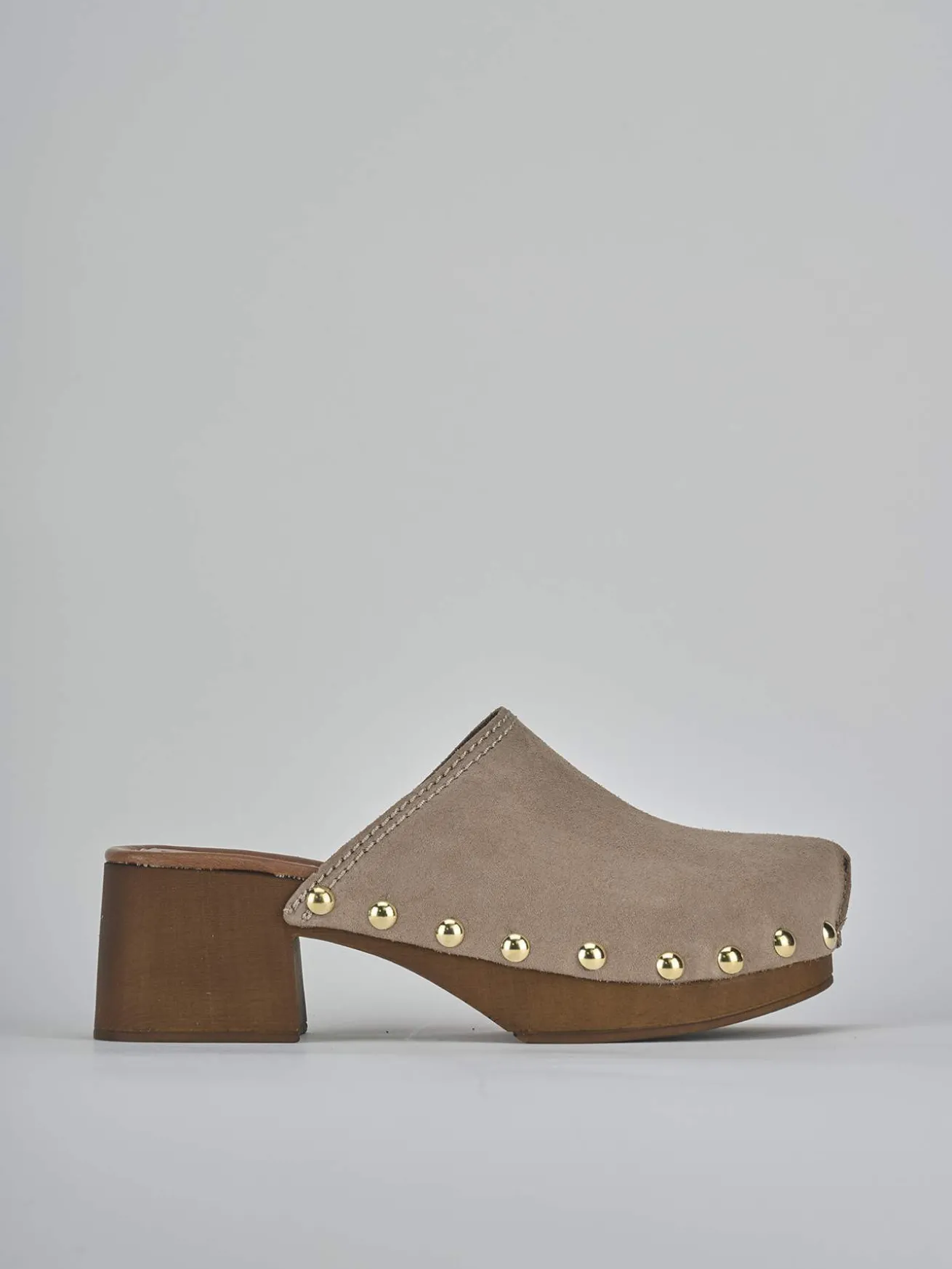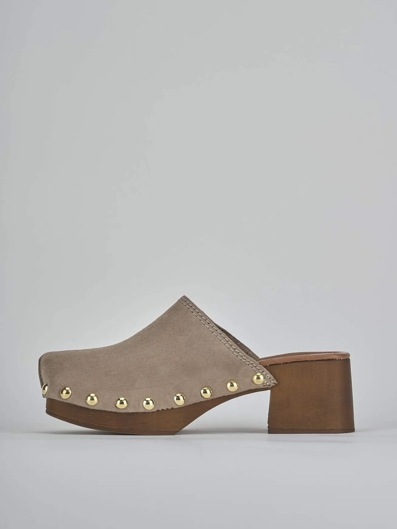 Sabot tacco 5 cm, fondo in gomma e soletto interno in vera pelle. Tomaia in morbido camoscio, punta affusolata, cuciture visibili, borchie laterali e tacco stabile per un look chic.