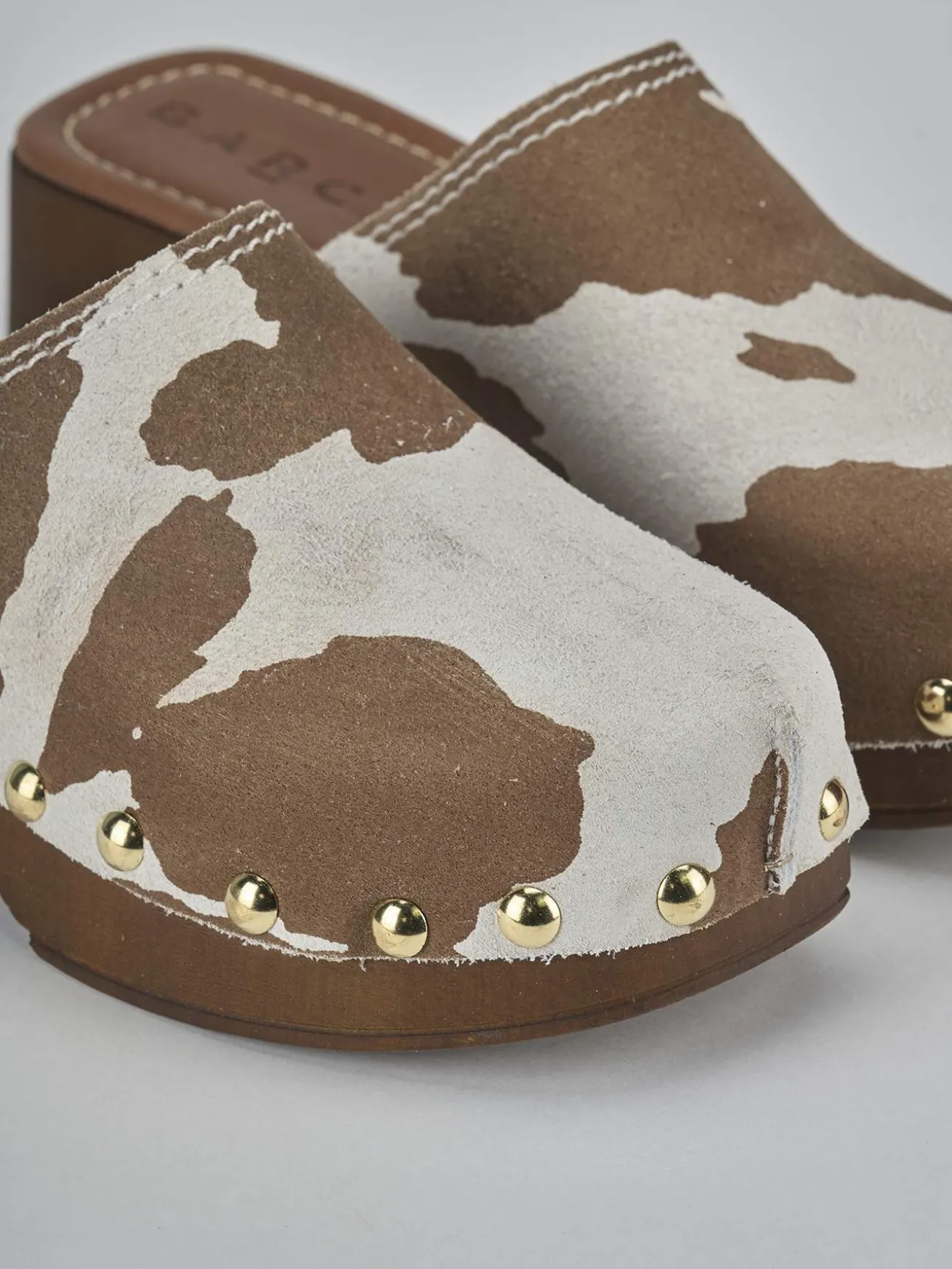 Sabot tacco 5 cm, fondo in gomma e soletto interno in vera pelle. Tomaia in morbida pelle foderata in cavallino muccato, punta affusolata, cuciture visibili, borchie laterali e tacco stabile per un look chic.