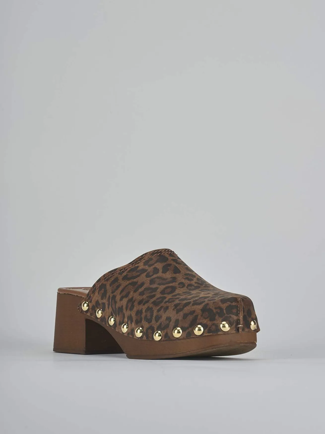 Sabot tacco 5 cm, fondo in gomma e soletto interno in vera pelle. Tomaia in morbido camoscio stampato leopardo, punta affusolata, cuciture visibili, borchie laterali e tacco stabile per un look chic.