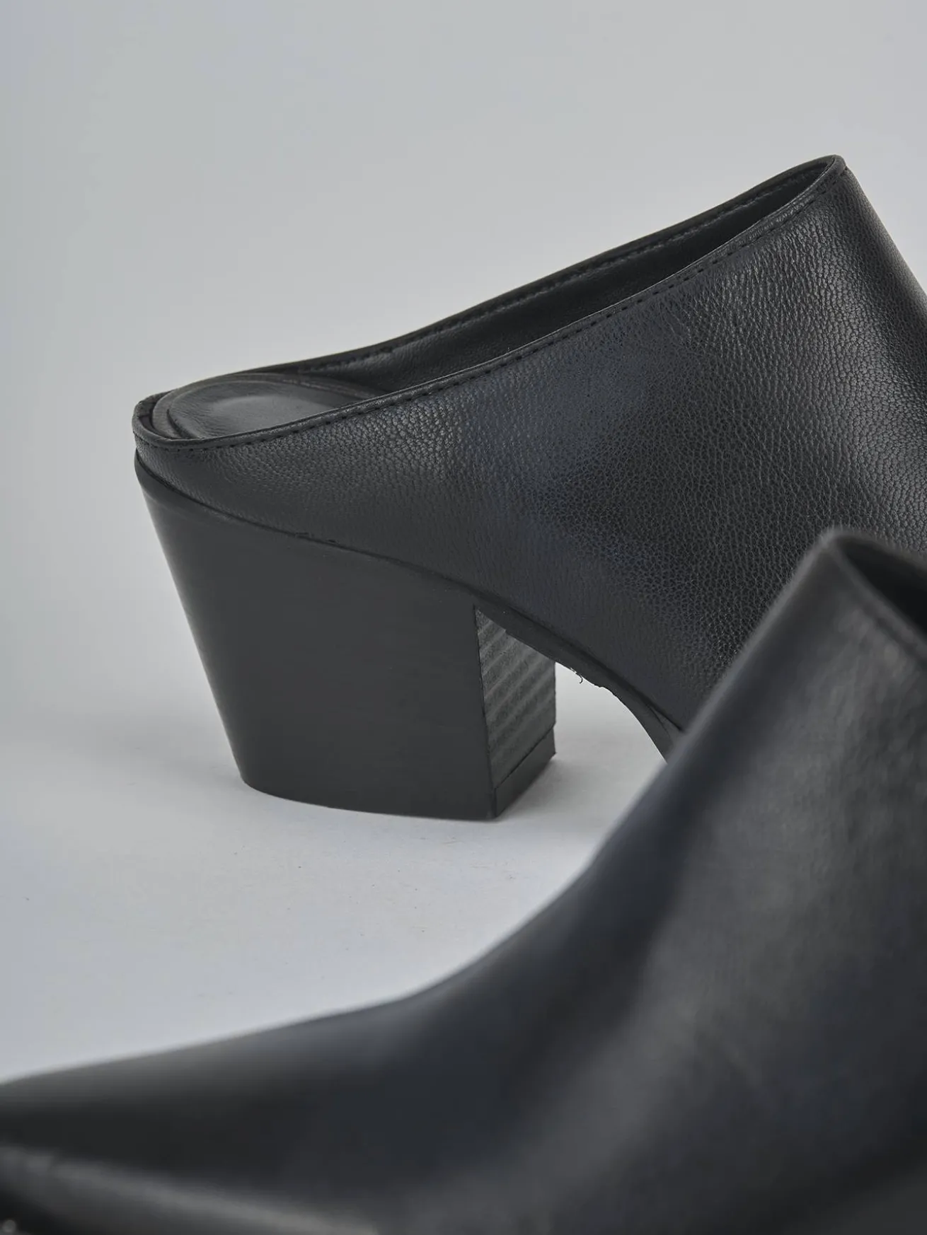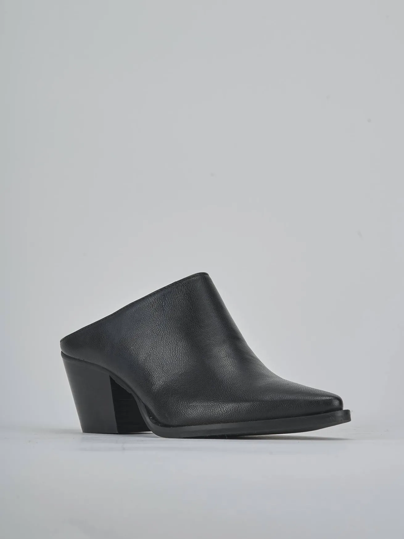 Sabot tacco 6 cm fondo in gomma e soletto interno in vera pelle. Tomaia in morbida pelle, punta sfilata, cuciture a mano e tacco grosso stabile. Guardolo sporgente con piccole borchie per un look chic.