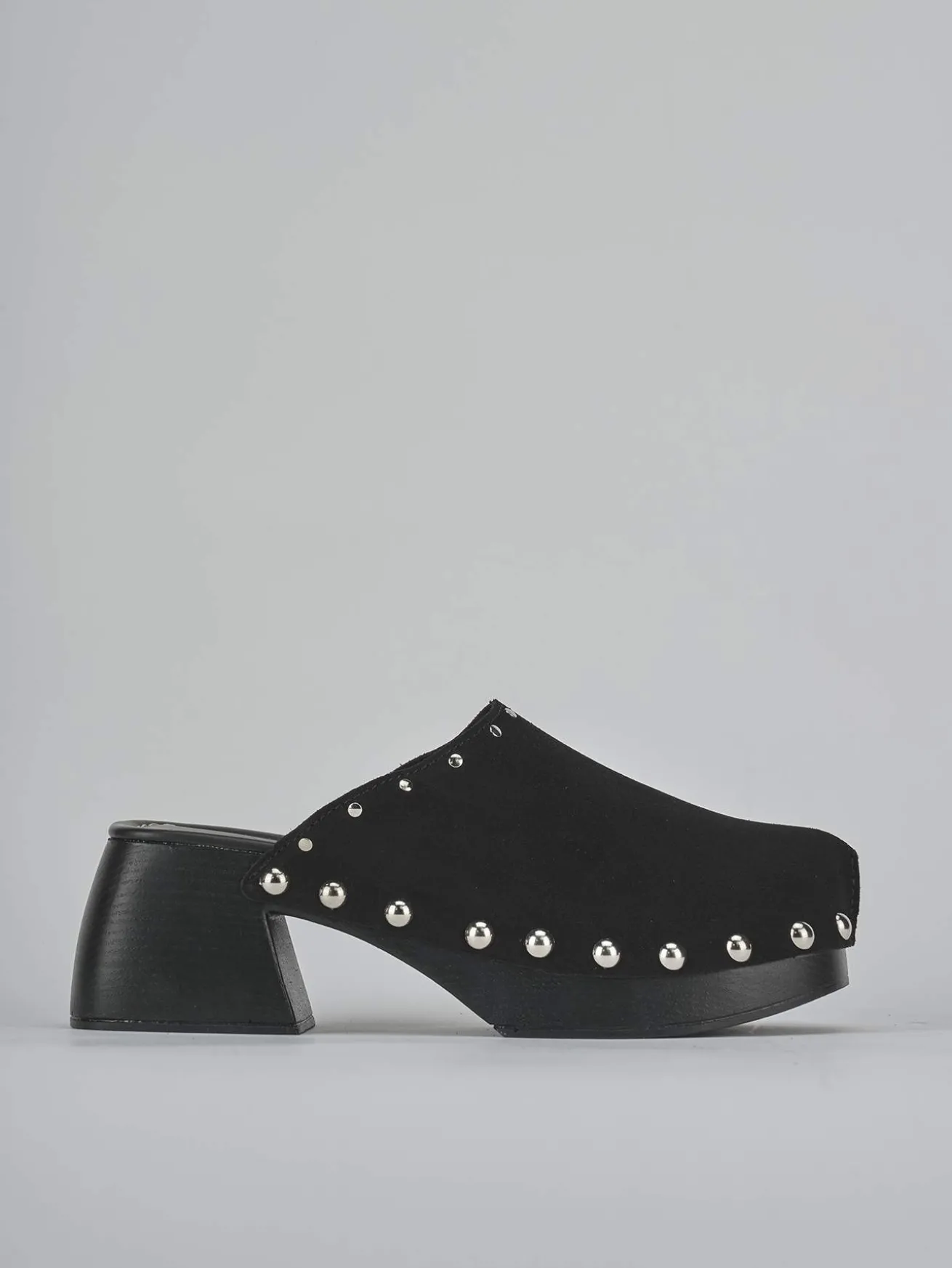 Sabot tacco 7 cm fondo in gomma e soletto interno in vera pelle. Tomaia in morbido camoscio, punta affusolata, cuciture a mano visibili e borchie lungo i bordi. Plateau di 1 cm e tacco stabile per un look chic.