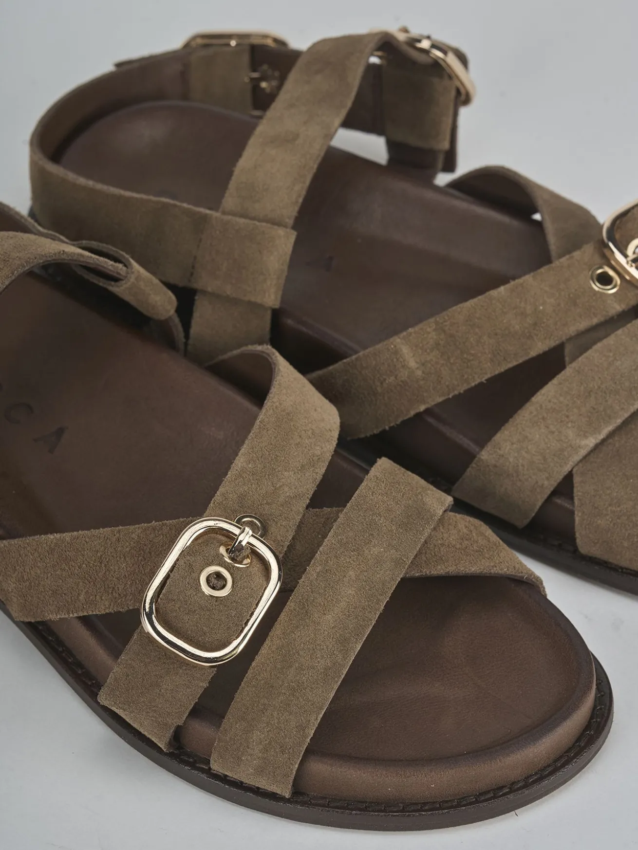 La tomaia in morbido camoscio avvolge il piede con delicatezza, mentre le fasce incrociate in punta aggiungono un tocco di stile raffinato.