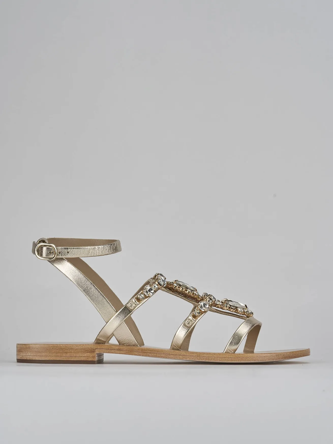 Realizzato in morbida pelle dorata, questo sandalo è il massimo del comfort grazie al suo tacco basso di 1 cm.