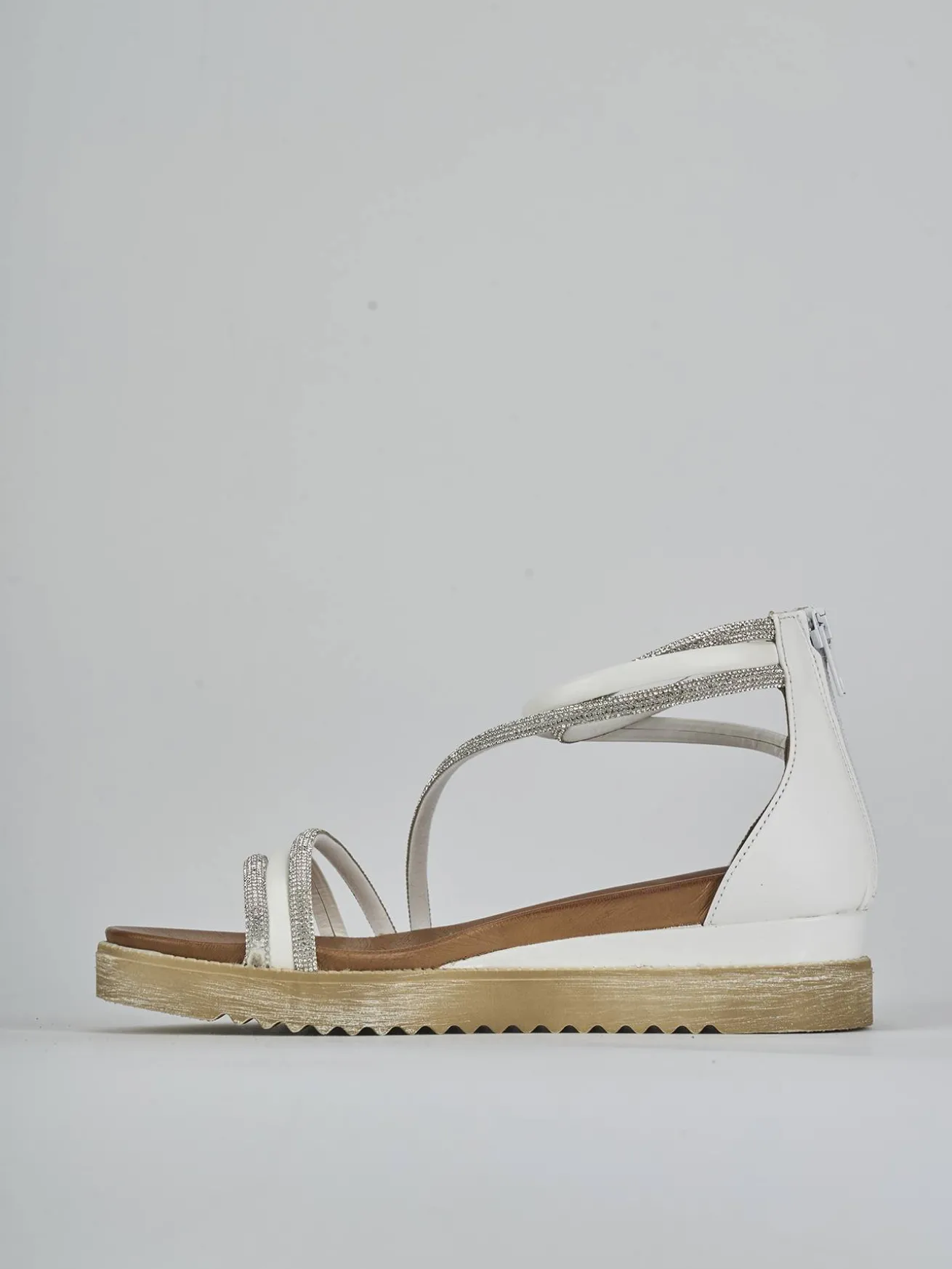 Sandalo tacco 2 cm fondo in gomma e soletto interno in vera pelle. Tomaia in morbida pelle, punta affusolata, fasce sulla punta, strass e cinturini in caviglia. Comoda cerniera posteriore per un look chic.