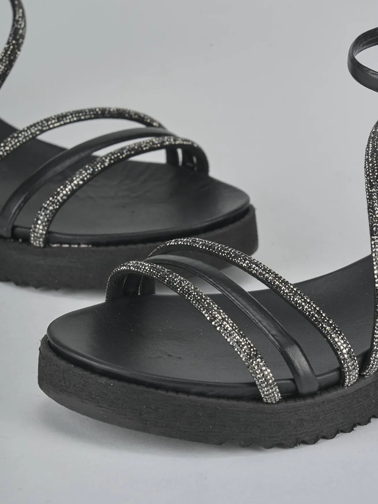 Sandalo tacco 2 cm fondo in gomma e soletto interno in vera pelle. Tomaia in morbida pelle, punta affusolata, fasce sulla punta, strass e cinturini in caviglia. Comoda cerniera posteriore per un look chic.