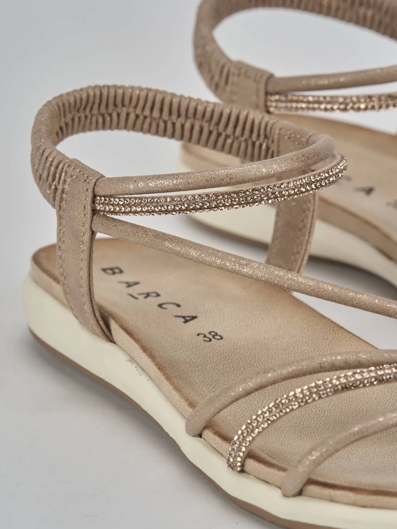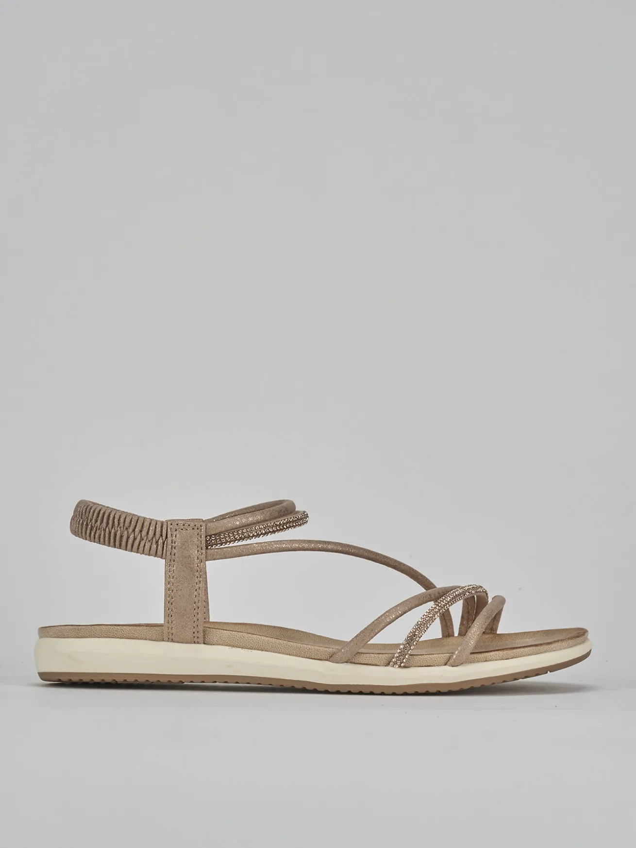 Sandalo tacco 1 cm fondo in leggera gomma e soletto interno in vera pelle. tomaia in morbida pelle, punta affusolata, tre fasce sottili, anelli in caviglia con strass e piccolo platform di 2 cm per un look chic.