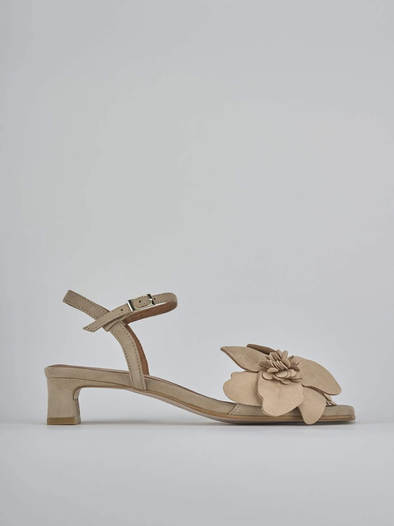 Sandalo tacco 4 cm fondo in leggerissima gomma e soletto interno in vera pelle. Tomaia in morbida pelle scamosciata, punta squadrata, fascia con accessori floreali, cinturino con fibbia regolabile e tacco stabile dritto. Perfetto per un look chic.