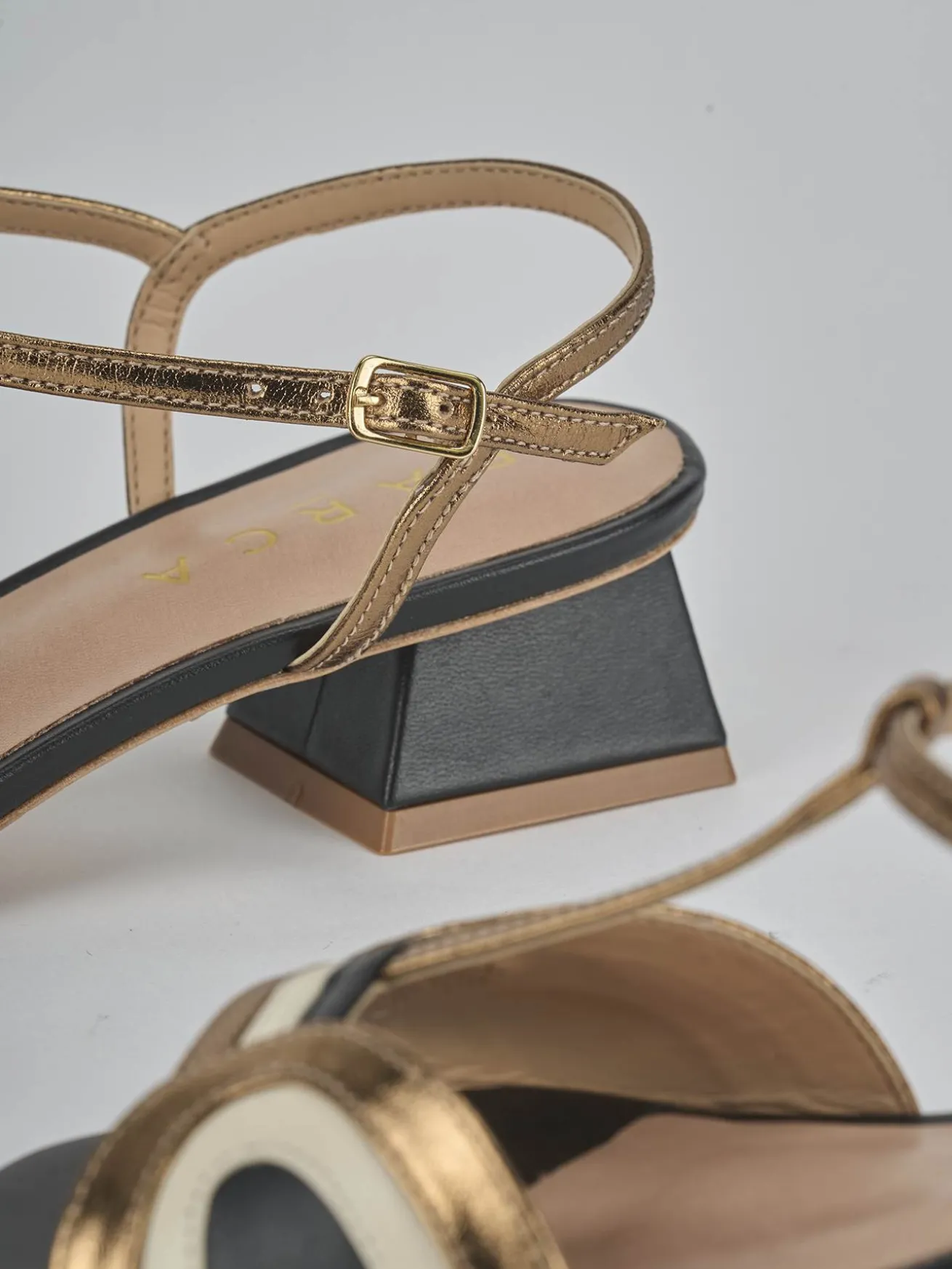 Sandalo tacco 4 cm fondo in leggerissima gomma e soletto interno in vera pelle. Tomaia in morbida pelle laminata con inserti tricolor, punta squadrata, fascia unica, cinturino a ‘T’ con fibbia regolabile e tacco grosso. Perfetto per un look cool.