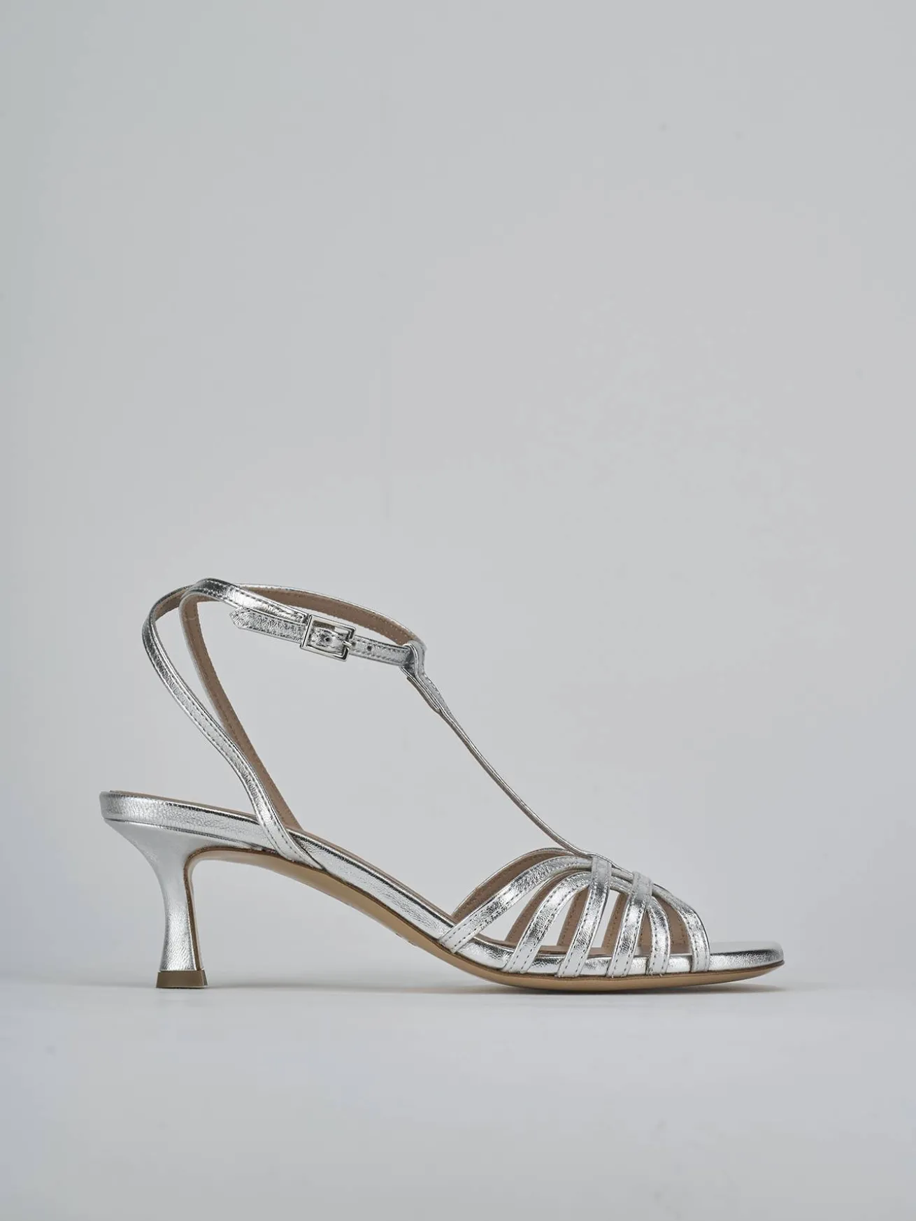 Sandalo tacco 5 cm fondo in cuoio e soletto interno in vera pelle. Tomaia in morbida pelle laminata, punta affusolata, fascette a incastro davanti e a ‘T’ con cinturino in caviglia con fibbia regolabile e tacco cool. Perfette sia con un vestito leggero che con dei jeans.