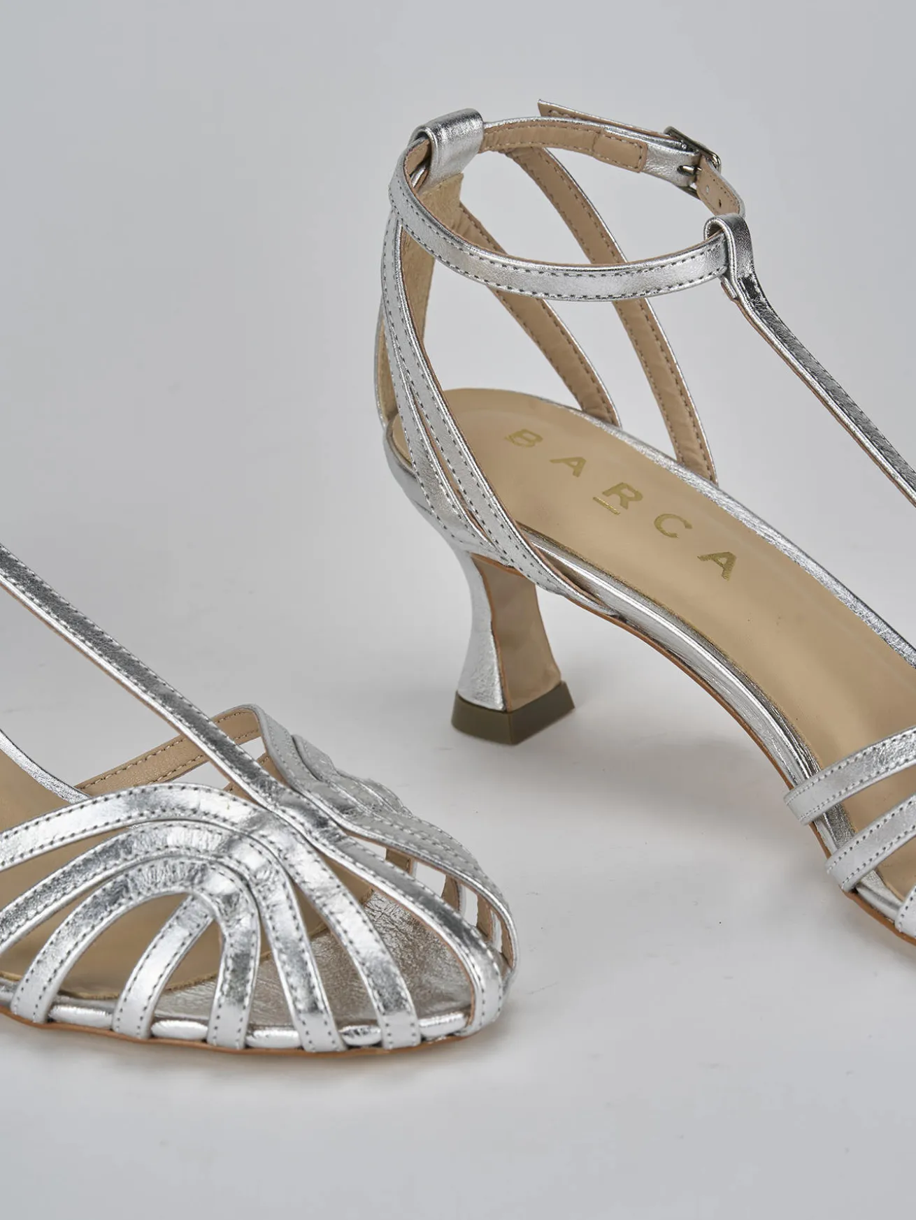 Sandalo tacco 5 cm fondo in leggerissima gomma e soletto interno in vera pelle. tomaia in morbida pelle, punta affusolata, fasce a cestino sulla punta e sul tallone, cinturino a ‘T’ con fibbia regolabile e tacco rocchetto. perfetto con un jeans e una camicia.