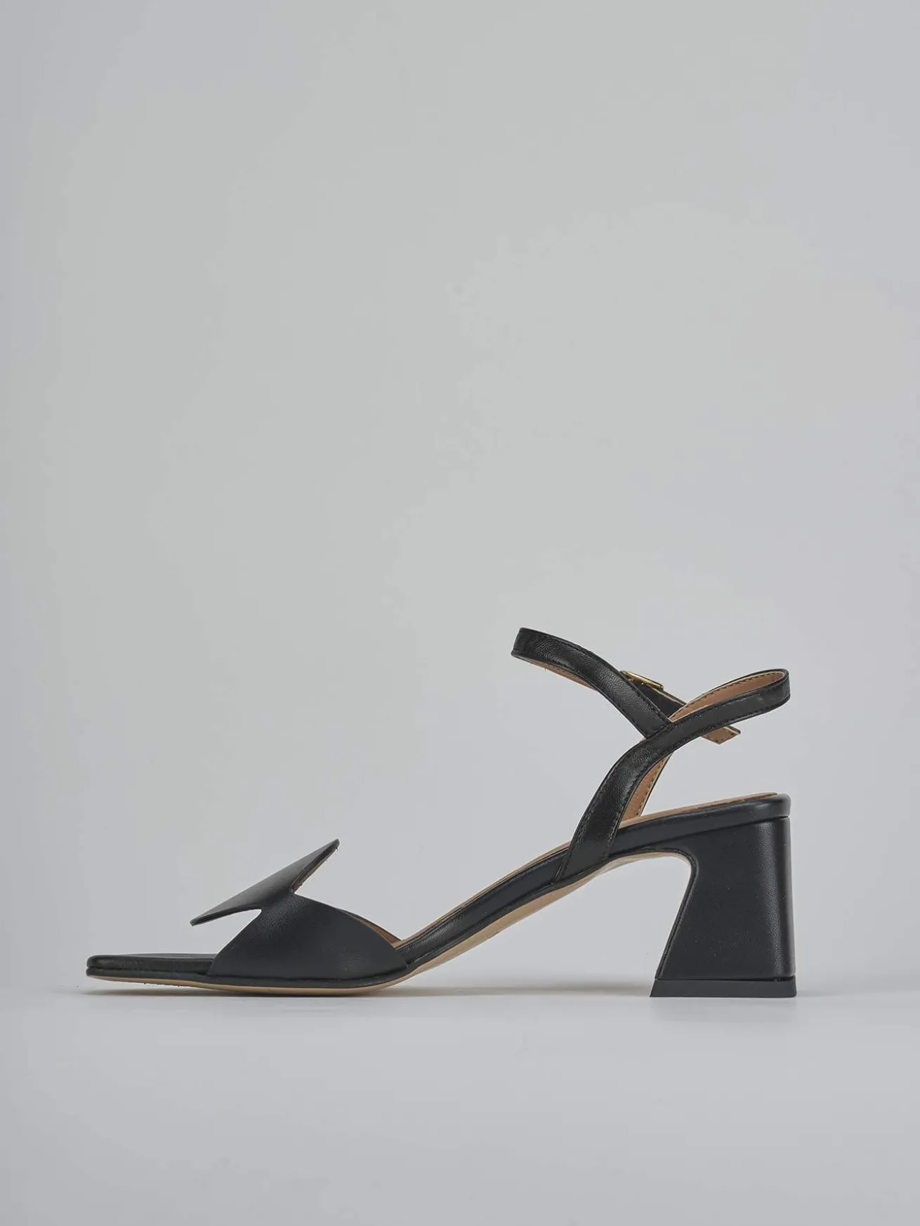 Sandalo tacco 5 cm fondo in leggerissima gomma e soletto interno in vera pelle. Tomaia in morbida pelle, punta squadrata, fascia unica con taglio geometrico, cinturino in caviglia con fibbia regolabile e tacco cool stabile. Perfetto con un vestito o una gonna.