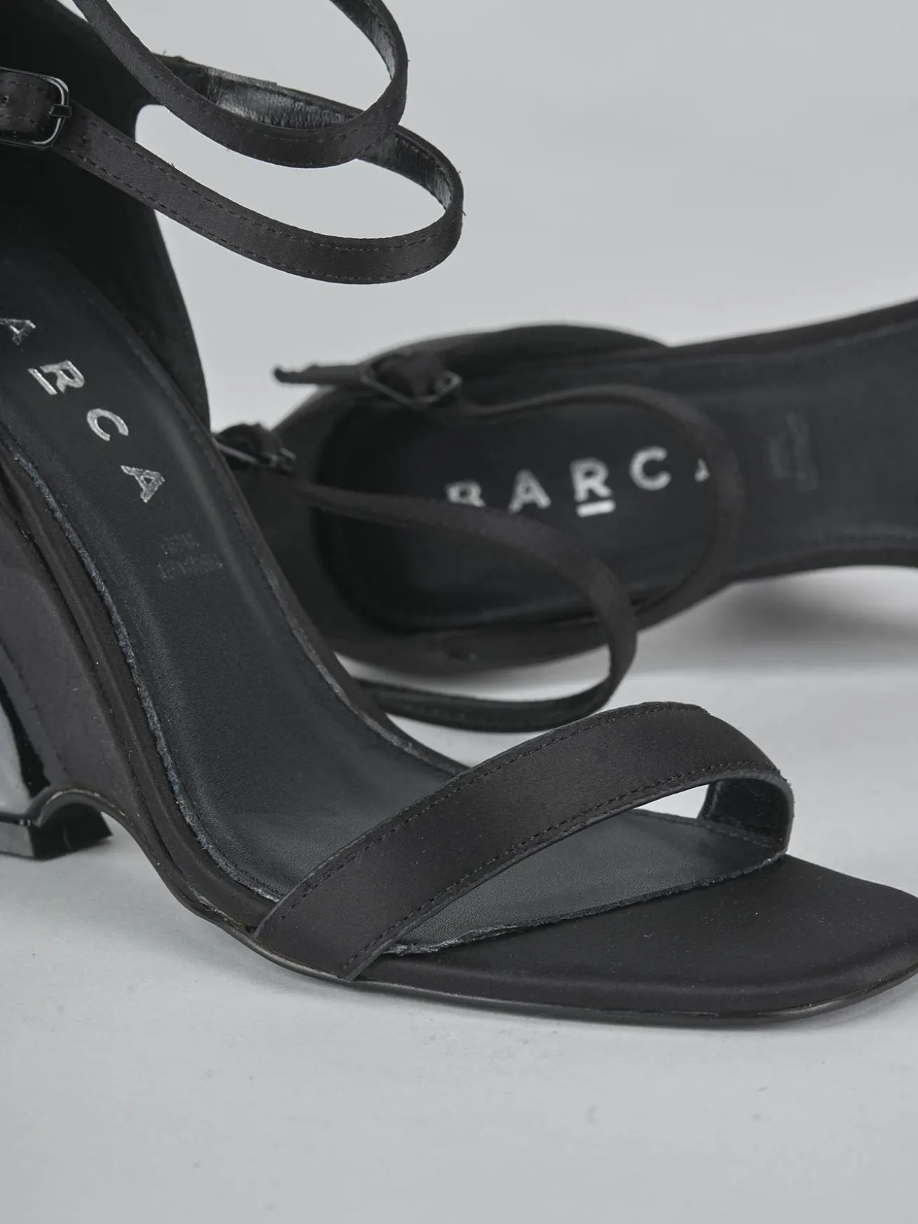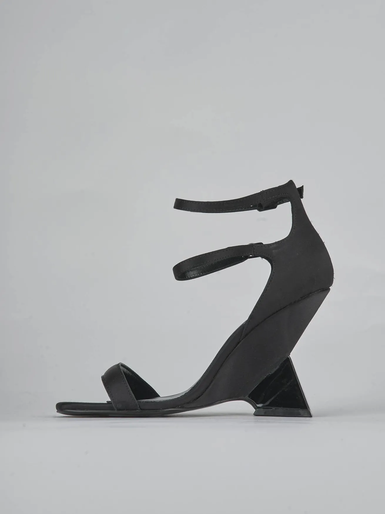Sandalo zeppa 5 cm fondo in leggera gomma e soletto interno in vera pelle. Tomaia in morbida pelle ricoperta da raso, punta squadrata, fascia unica, due cinturini in caviglia con fibbia regolabile e nuovissimo tacco pieno per un look cool.