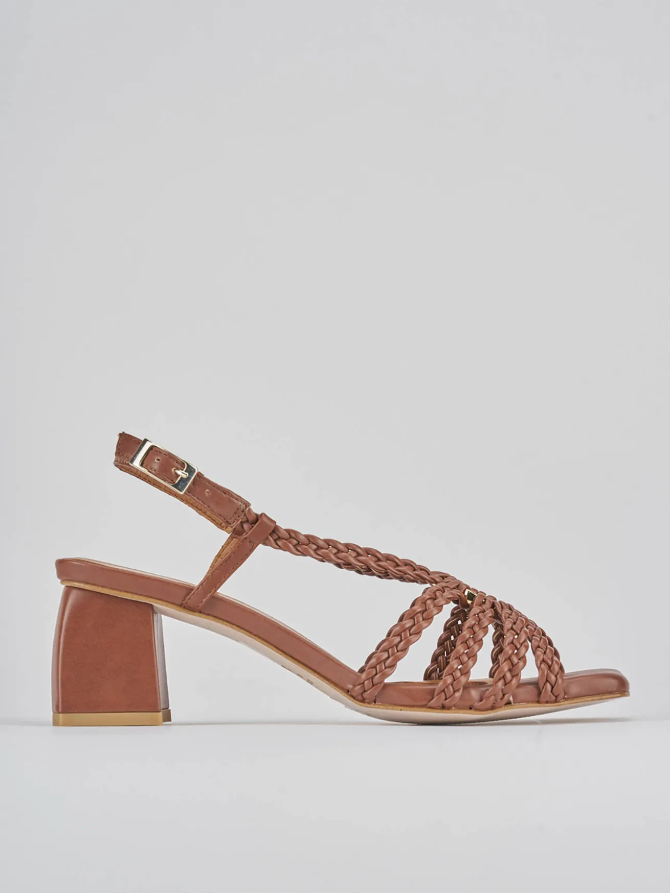 Sandalo tacco 6 cm fondo in cuoio e soletto interno in vera pelle. tomaia in morbida pelle, punta squadrata, fasce intrecciate che convergono verso l’accessorio, cinturino in caviglia con fibbia regolabile per un fit perfetto. tacco stabile per un look cool.