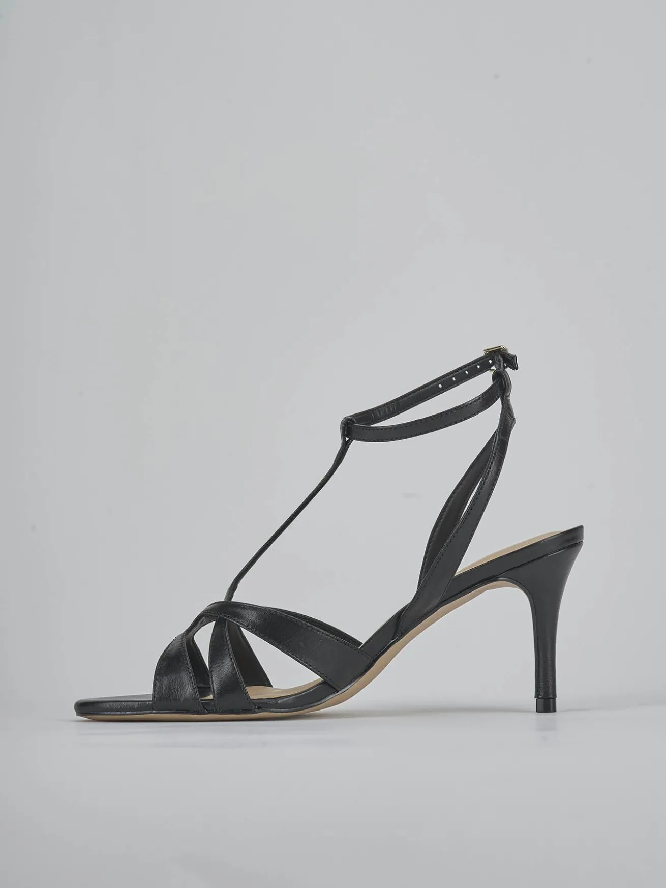 Sandalo tacco 6 cm fondo in leggerissima gomma e soletto interno in vera pelle. Tomaia in morbida pelle, punta affusolata, fascette e cinturino a ‘T’ con fibbia regolabile e nuovissimo tacco rocchetto per un look chic. Ideale anche come sandalo cerimonia per le tue occasioni piu’ importanti.