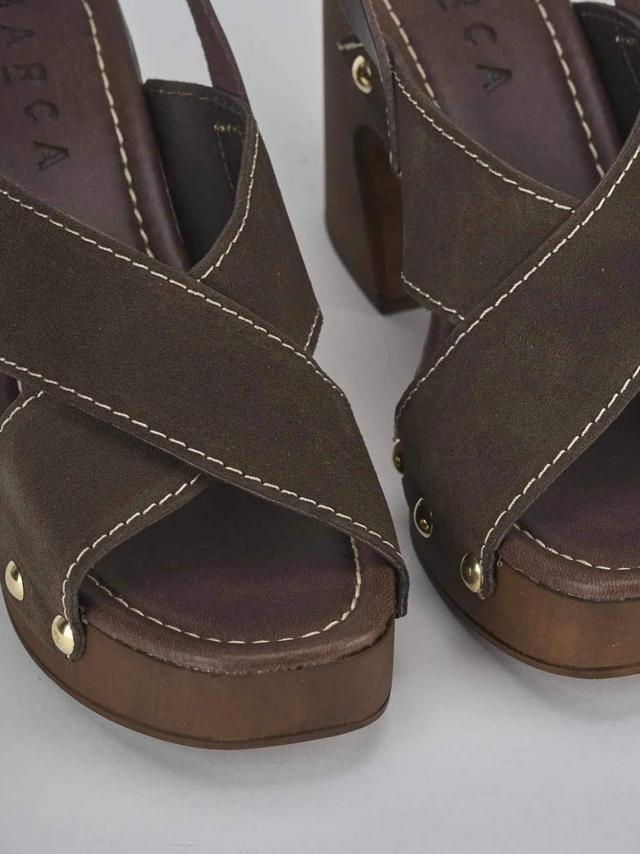 Sandalo tacco 9 cm fondo in gomma e soletto interno in vera pelle. Tomaia in morbido camoscio, punta leggermente squadrata, cuciture visibili, fasce incrociate, cinturino con fibbia regolabile sul tallone, borchie laterali. Plateau di 2 cm anteriore. Per un look sia casual sia elegante.