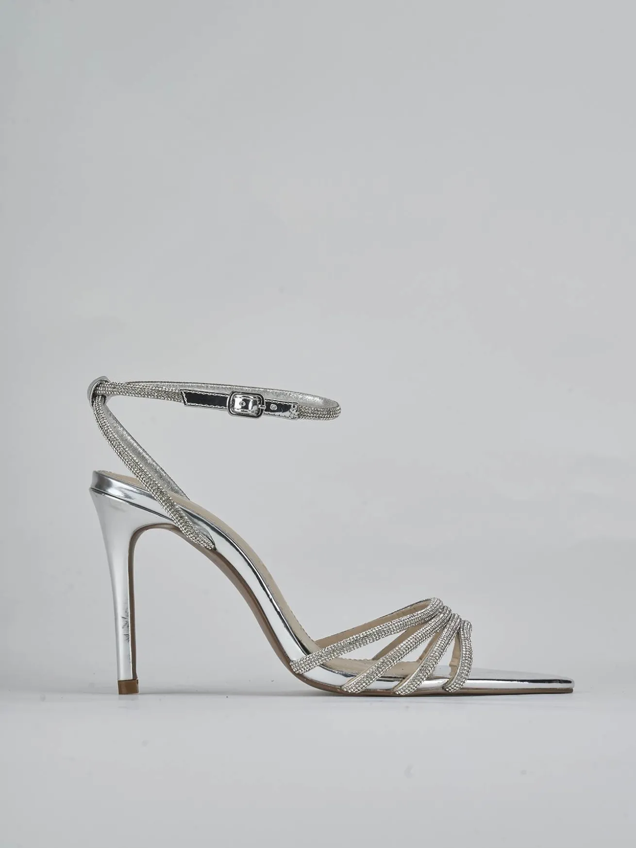 Sandalo tacco 9 cm fondo in leggera gomma e soletto interno in vera pelle. Tomaia in morbida pelle, punta sfilata, fascette con strass, cinturino con fibbia regolabile e tacco fino. Perfetto per le tue occasioni più speciali.